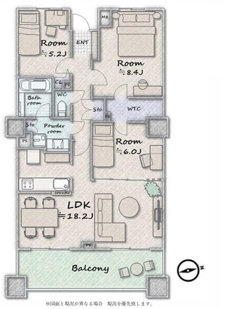 | 間取 | 3LDK (LDK18.2帖、洋室8.4帖、洋室6帖、洋室5.2帖) | ||