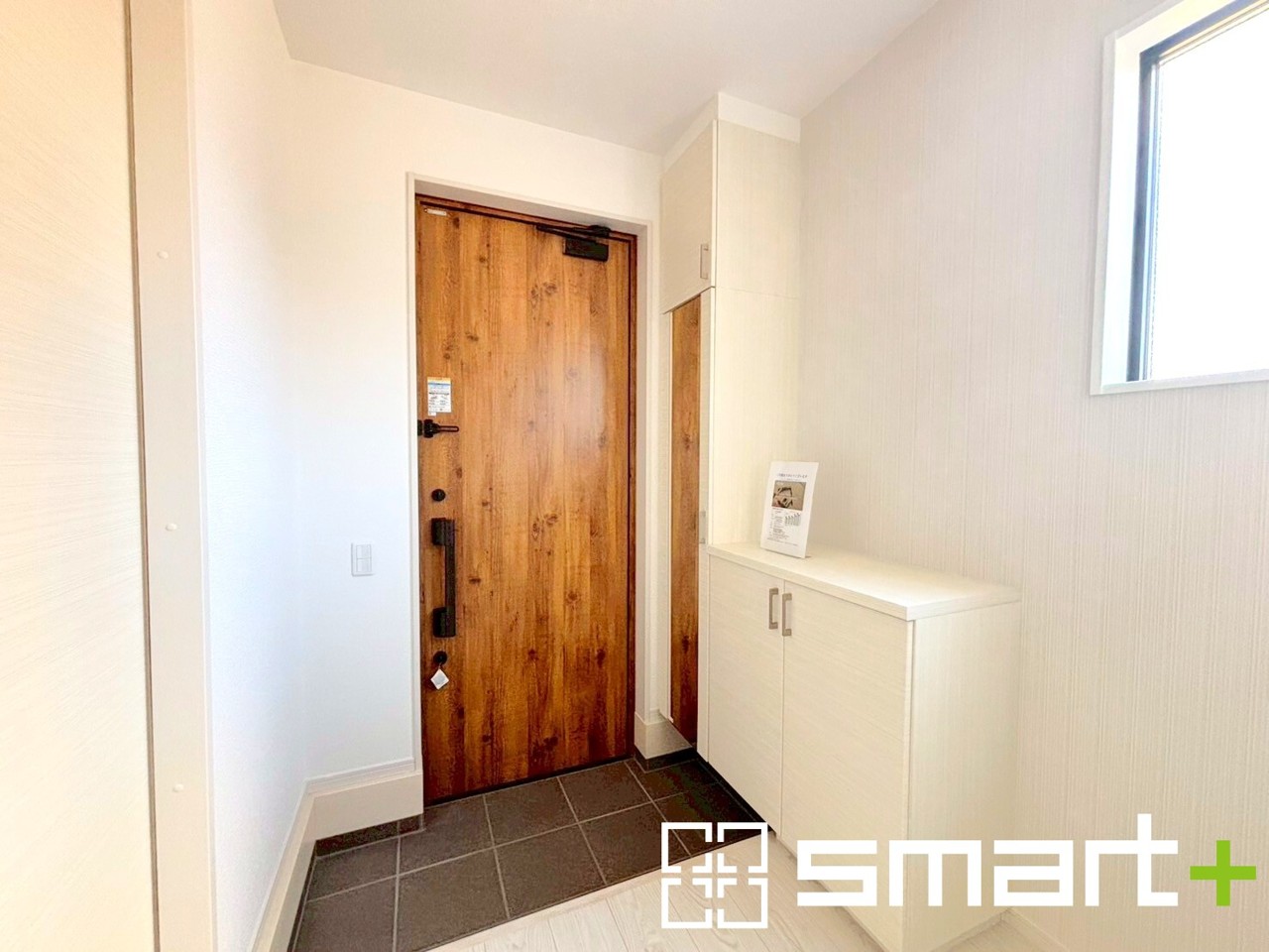 ~穏やかな陽が入る玄関~ ・圧迫感がなくスッキリ広々とした印象の玄関。窓からは明るい陽光が差し込みます。 ・備え付けのシューズボックスはミラー付なので朝やお出かけ前の身支度チェックに大活躍です。