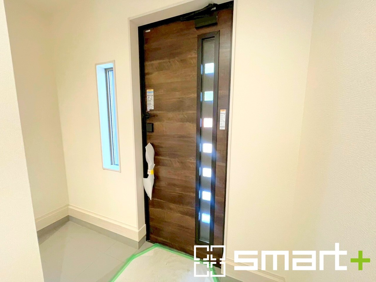 2号棟 ~穏やかな陽の入る玄関~ ・玄関ドアのガラス部分に加えてシューズボックスの間に窓を設ける事で穏やかな陽の入る玄関に。 ・ご家族やご来客を明るい空間で出迎えてくれます。