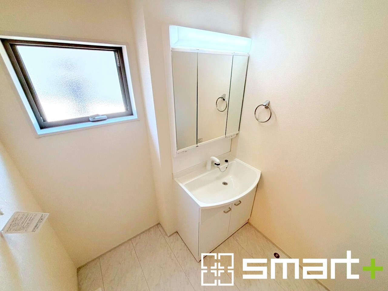 ~明るい洗面スペース~ ・窓から明るい陽が入るので、気持ちよく朝の支度ができますね。 ・使い勝手の良い三面鏡タイプのシャワー付き洗面化粧台。鏡の裏に収納があるので洗面台周りもスッキリ。