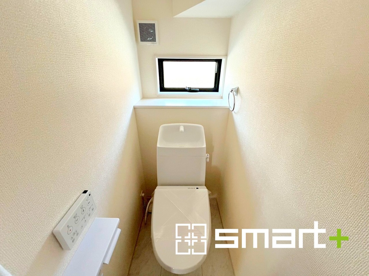 ~窓付きの明るいトイレ~ ・清潔感あるシャワートイレ。窓があるので換気もしやすく快適ですね。 ・背面にある棚はトイレットペーパーなどの置き場や飾り棚としても利用できますね。