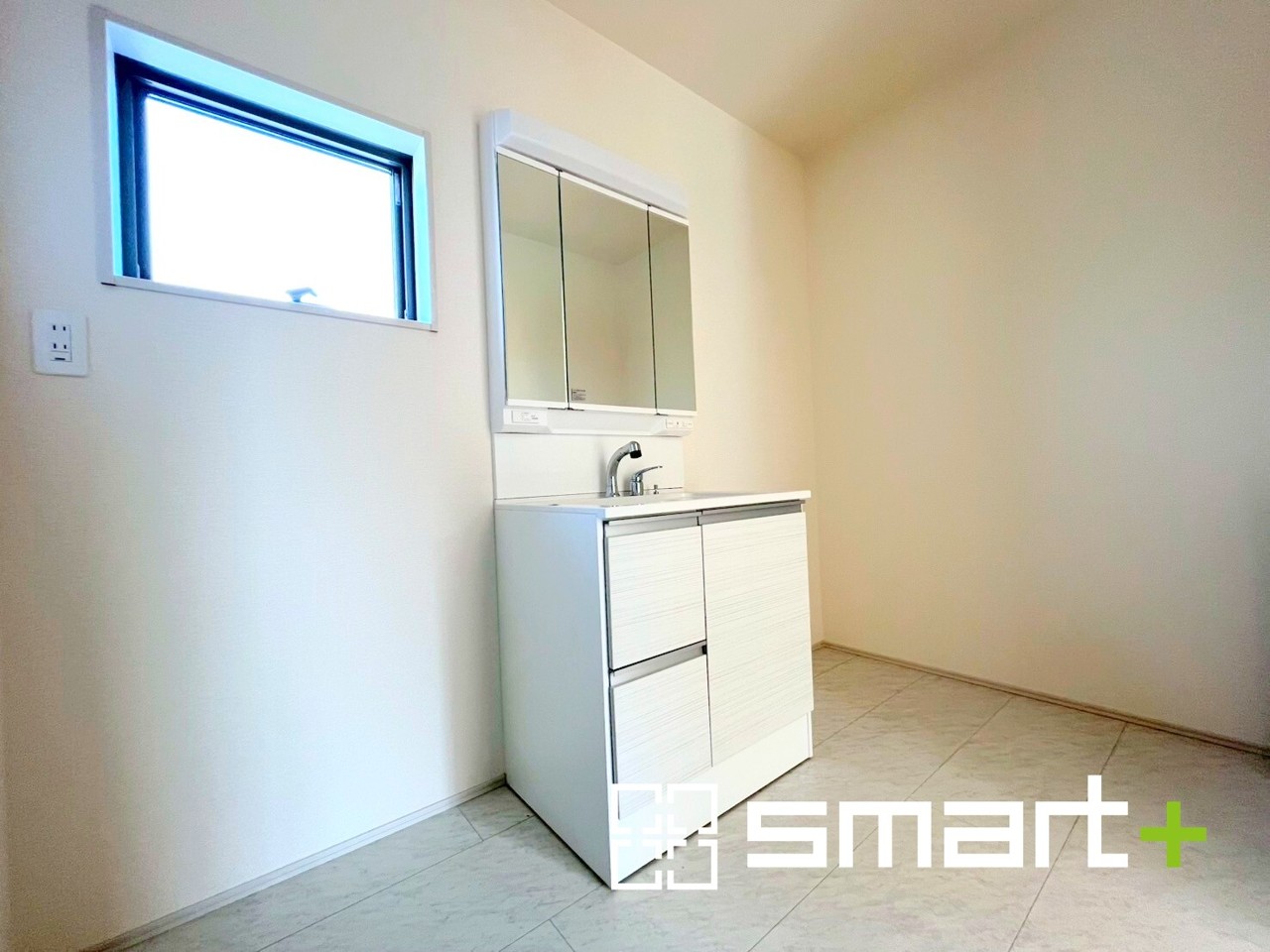 ~明るい洗面スペース~ ・窓から明るい陽が入り、気持ちよく朝の支度ができますね。 ・使い勝手の良い三面鏡タイプのシャワー付き洗面化粧台。鏡の裏に収納があるので洗面台周りもスッキリ。