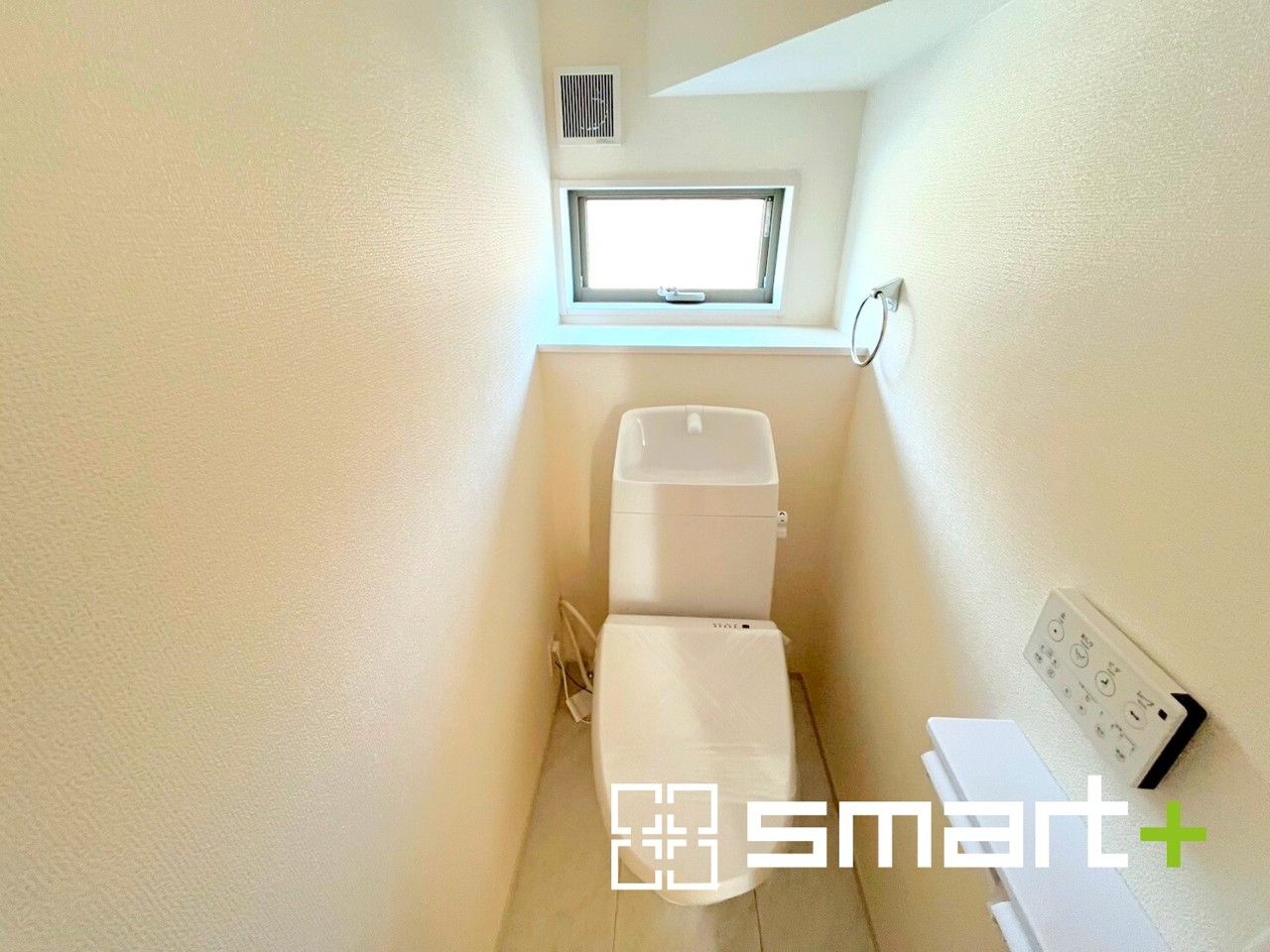 ~窓付きの明るいトイレ~ ・清潔感あるシャワートイレ。窓があるので換気もしやすく快適ですね。 ・背面にある棚はトイレットペーパーなどの置き場や飾り棚としても利用できますね。