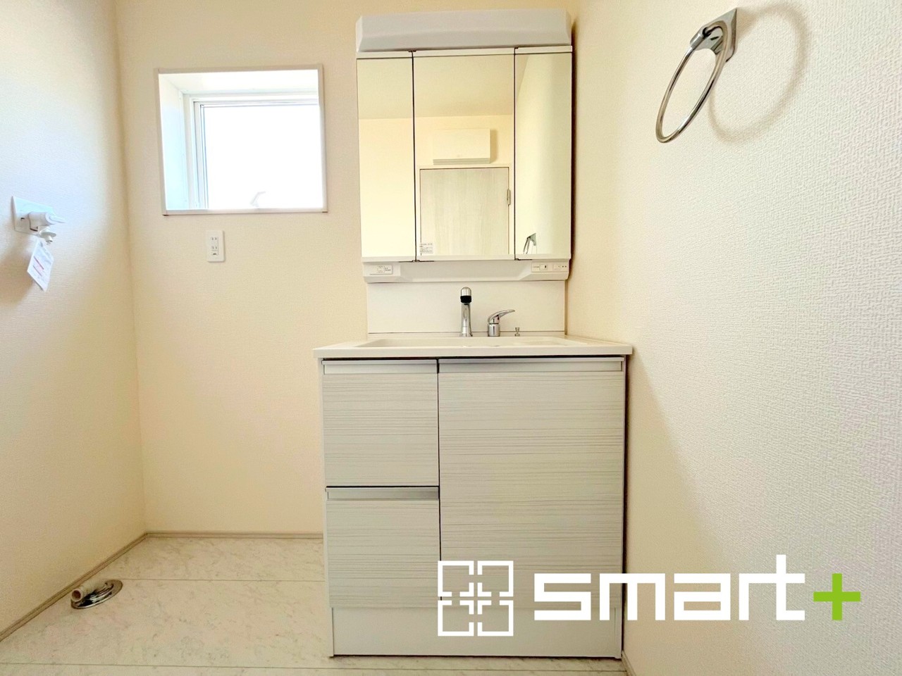 ~明るい洗面スペース~ ・窓から明るい陽が入り、気持ちよく朝の支度ができますね。 ・使い勝手の良い三面鏡タイプのシャワー付き洗面化粧台。鏡の裏に収納があるので洗面台周りもスッキリ。