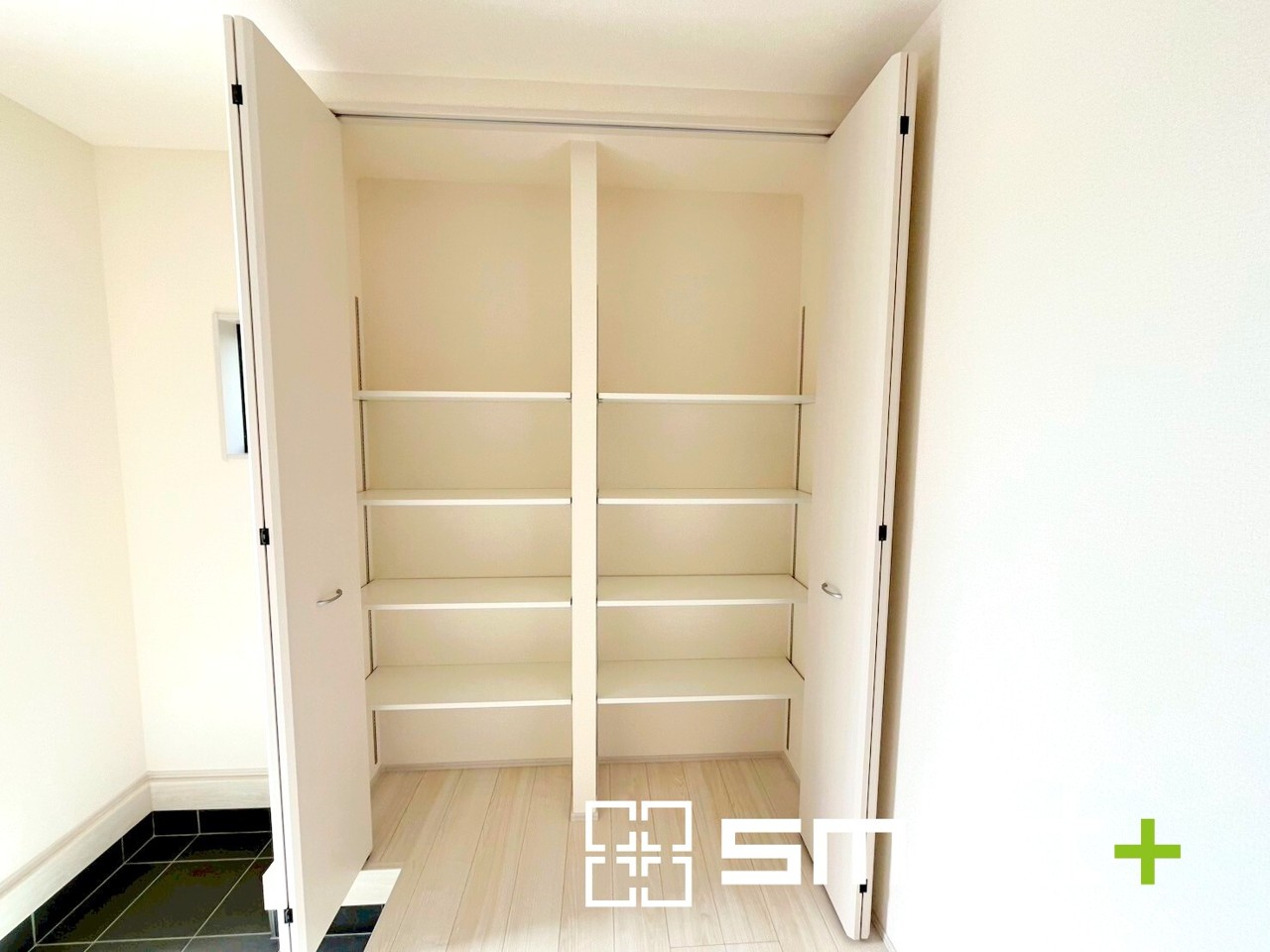 ~たっぷりしまえるシューズボックス~ ・備え付けのシューズボックスは充分な容量を確保。 ・便利な稼働式の棚で高さや大きさのあるものもスッキリしまえて快適。