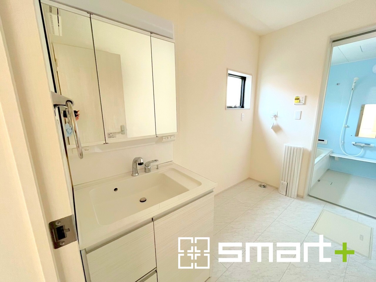 ~人気の三面鏡を採用~ ・洗面台は三面鏡仕様なので鏡の角度を変える事で頭の後ろの方までご確認可能です。 ・鏡の裏が収納になっておりますので、洗面台周りもスッキリと片付きます。