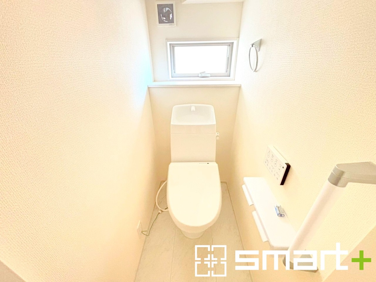 ~窓付きの明るいトイレ~ ・清潔感あるシャワートイレ。窓があるので換気もしやすく快適ですね。 ・背面にある棚はトイレットペーパーなどの置き場や飾り棚としても利用できますね。