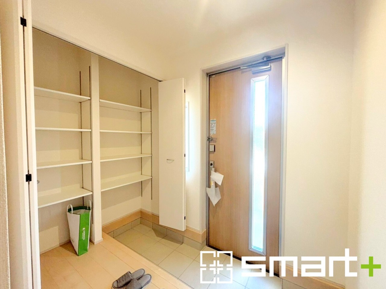 ~穏やかな陽が入る玄関~ ・窓に加えて玄関ドアのガラス部分からも穏やかな陽が入り、明るい玄関になります。 ・備え付けのシューズボックスはたっぷりしまえて玄関がスッキリ片付きますね。