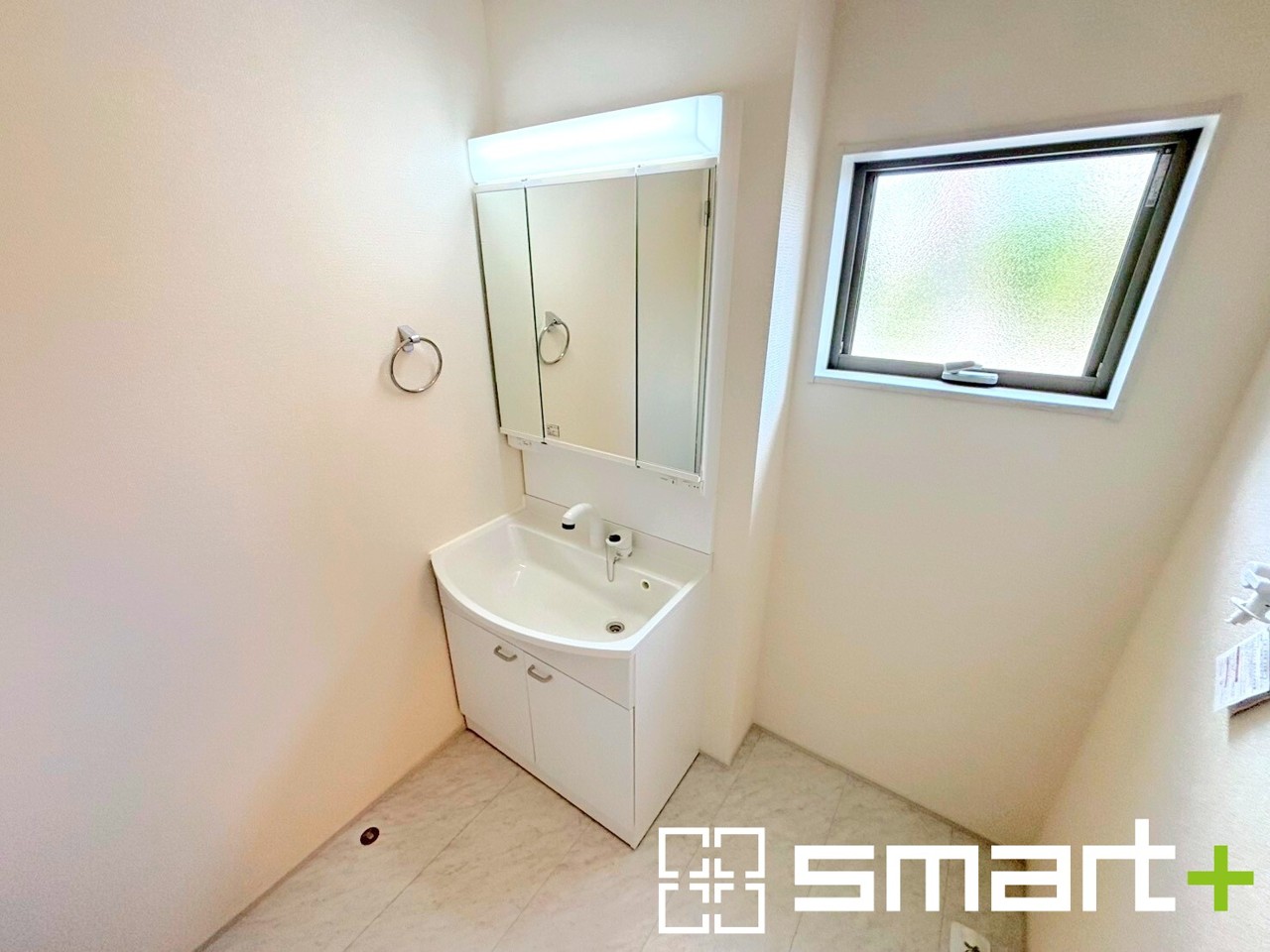 ~明るい洗面スペース~ ・窓から明るい陽が入り、気持ちよく朝の支度ができますね。 ・使い勝手の良い三面鏡タイプのシャワー付き洗面化粧台。鏡の裏に収納があるので洗面台周りもスッキリ。