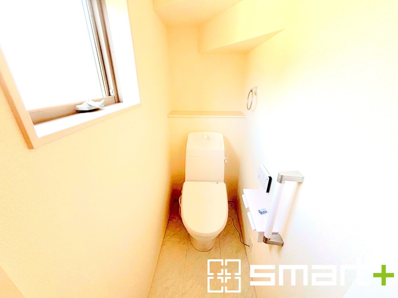 ~窓付きの明るいトイレ~ ・清潔感あるシャワートイレ。窓があるので換気もしやすく快適ですね。 ・背面にある棚はトイレットペーパーなどの置き場や飾り棚としても利用できますね。