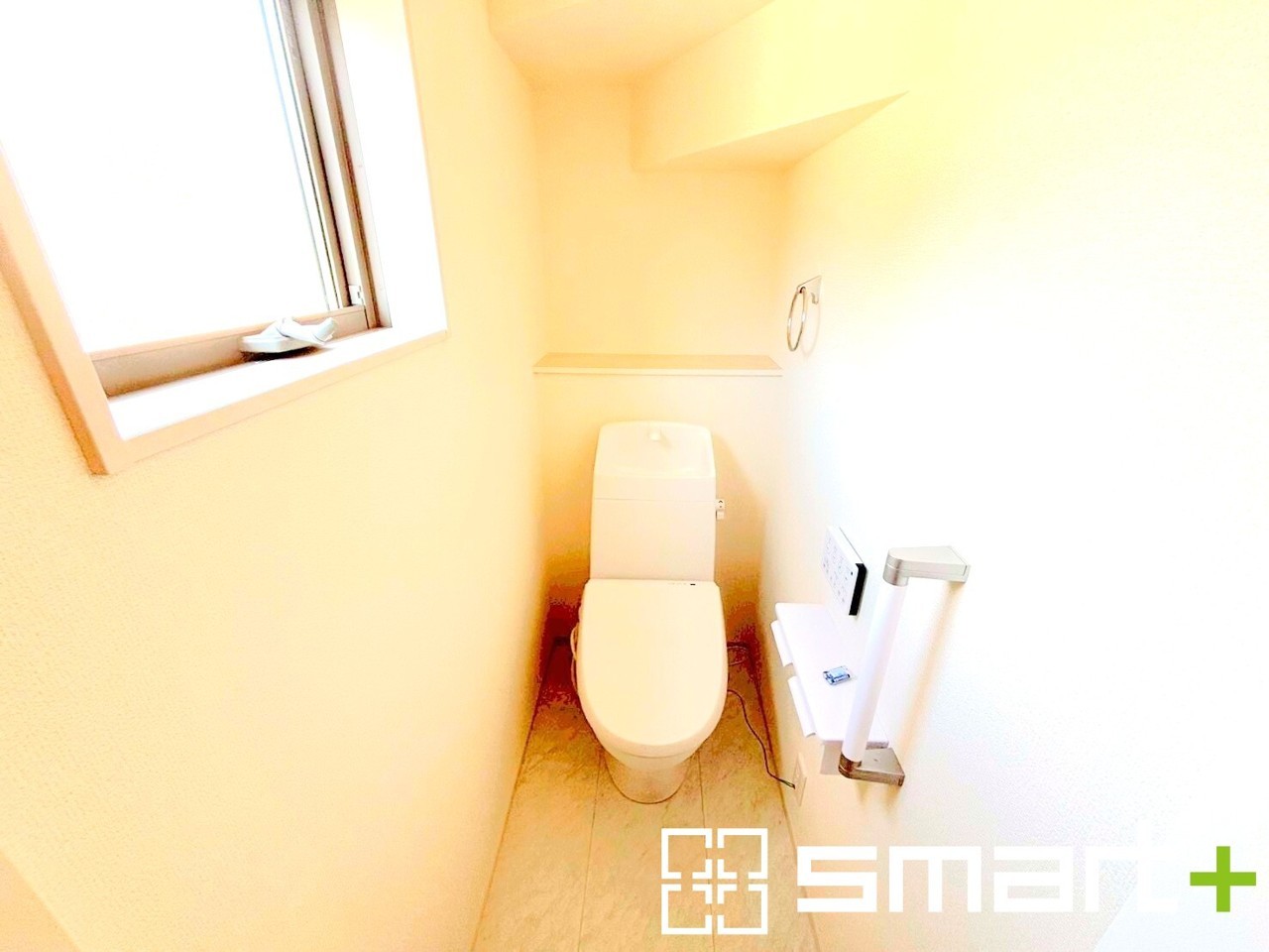 2号棟 ~窓付きの明るいトイレ~ ・清潔感あるシャワートイレ。窓があるので換気もしやすく快適ですね。 ・背面にある棚はトイレットペーパーなどの置き場や飾り棚としても利用できますね。