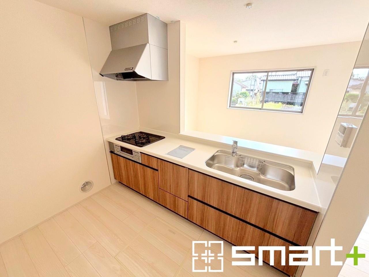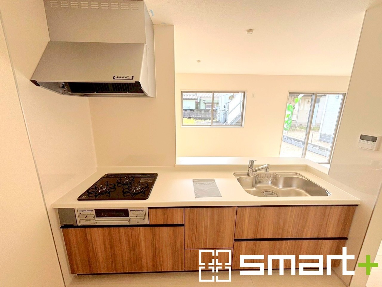 2号棟 ~使い勝手の良いシステムキッチン~ ・料理がしやすい設計のキッチンでお料理もはかどりますね。 ・もちろんキッチン下部は収納になっておりますので、フライパンなども収納可能です。