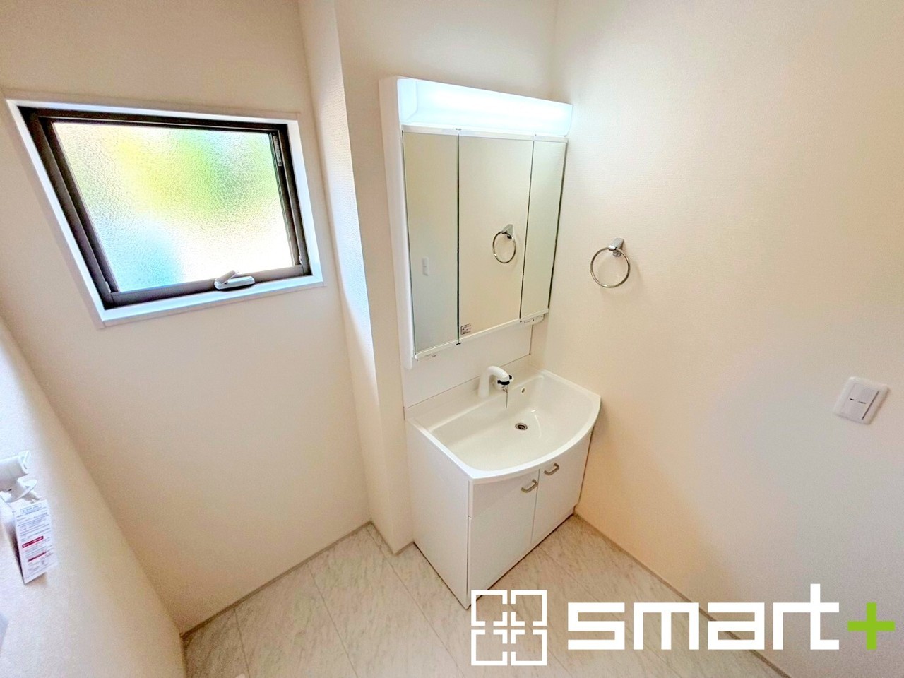 2号棟 ~明るい洗面スペース~ ・窓から明るい陽が入り、気持ちよく朝の支度ができますね。 ・使い勝手の良い三面鏡タイプのシャワー付き洗面化粧台。鏡の裏に収納があるので洗面台周りもスッキリ。