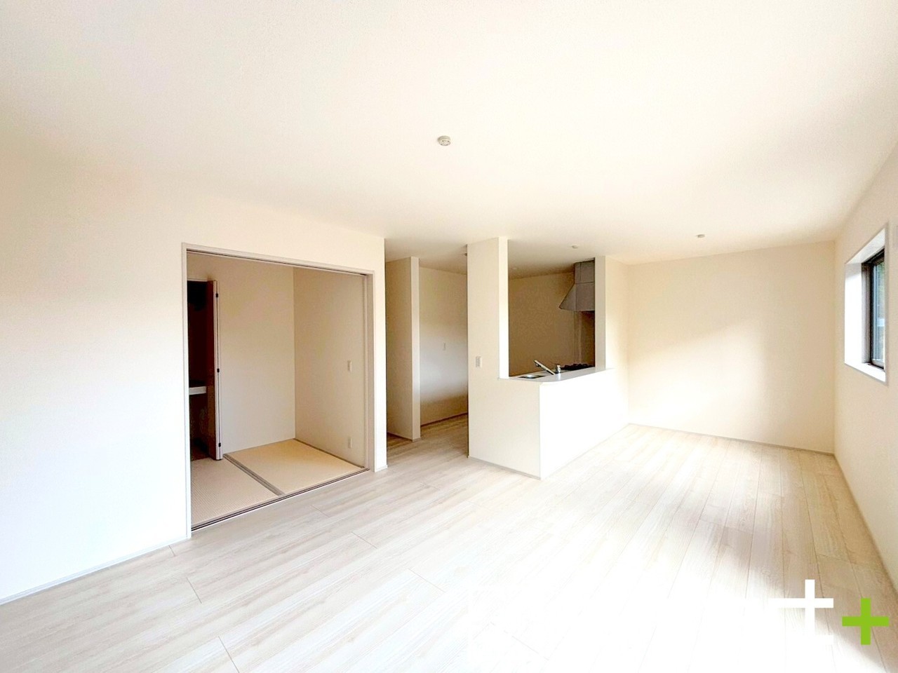 2号棟 ~家族団らんにピッタリの広々リビング~ ・穏やかな陽だまりに包まれる居心地の良いLDKは、ご家族が集まる憩いのスペースに。 ・隣接の和室を続き間として利用すれば20帖超の広々空間になります。