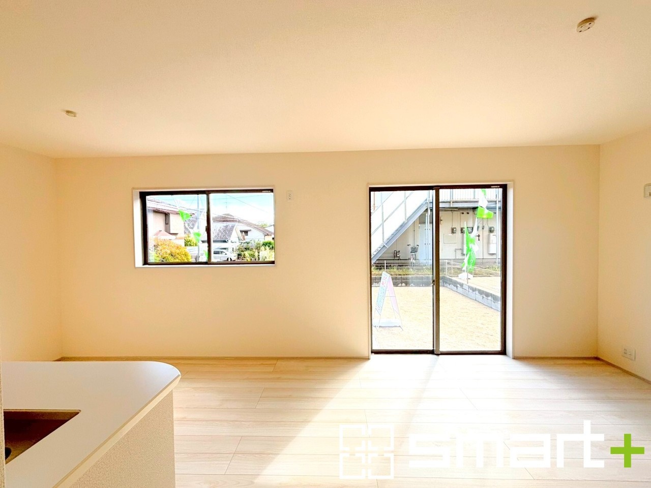 2号棟 ~穏やかな陽の入るLDK~ ・大きな窓のあるLDKは陽当りも良好で明るい空間となっております。 ・ご家族団らんなど過ごす時間の多いLDKが明るいのは嬉しいポイントですね。