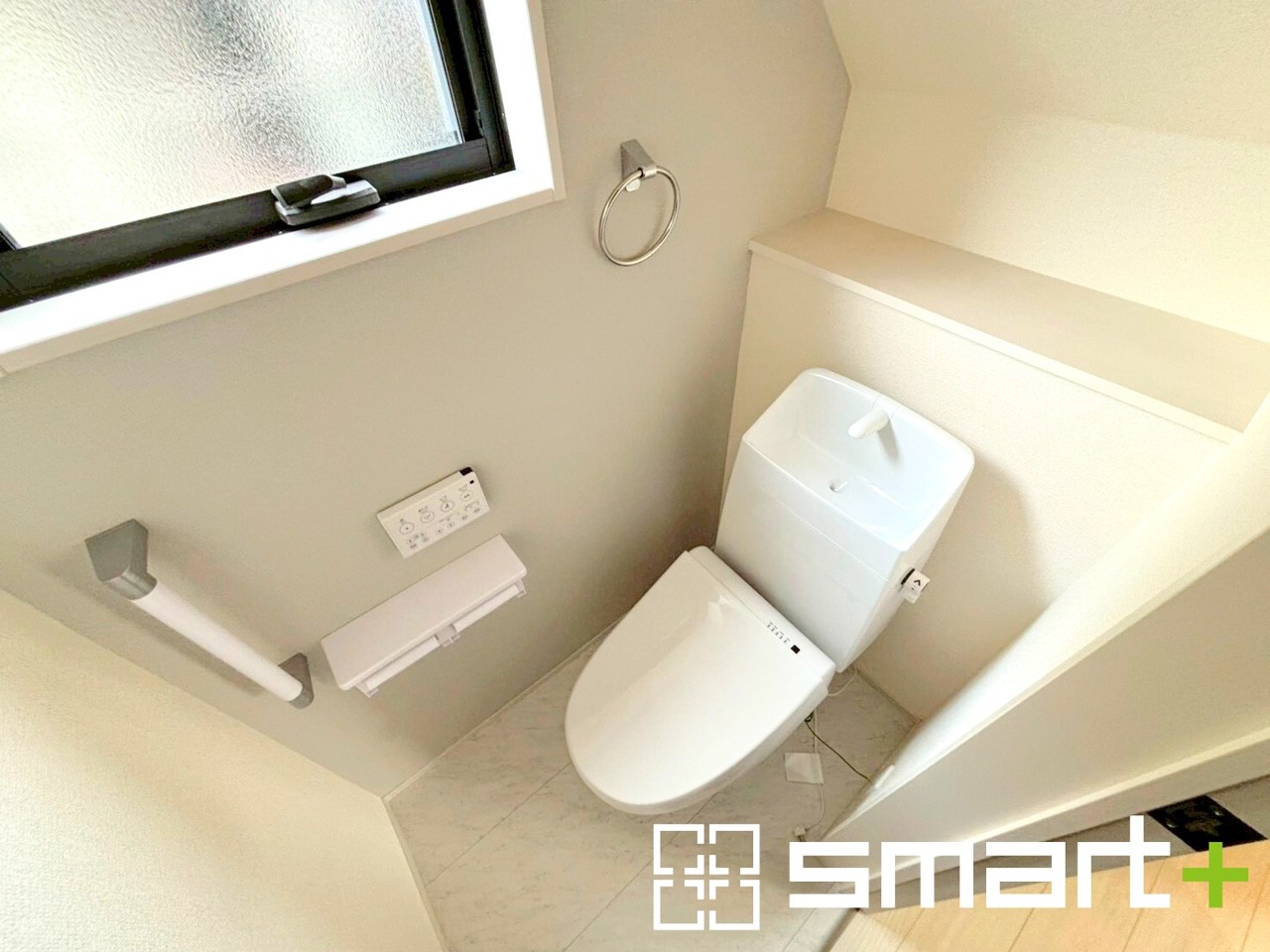 ~窓付きの明るいトイレ~ ・清潔感あるシャワートイレ。窓があるので換気もしやすく快適ですね。 ・背面にある棚はトイレットペーパーなどの置き場や飾り棚としても利用できますね。