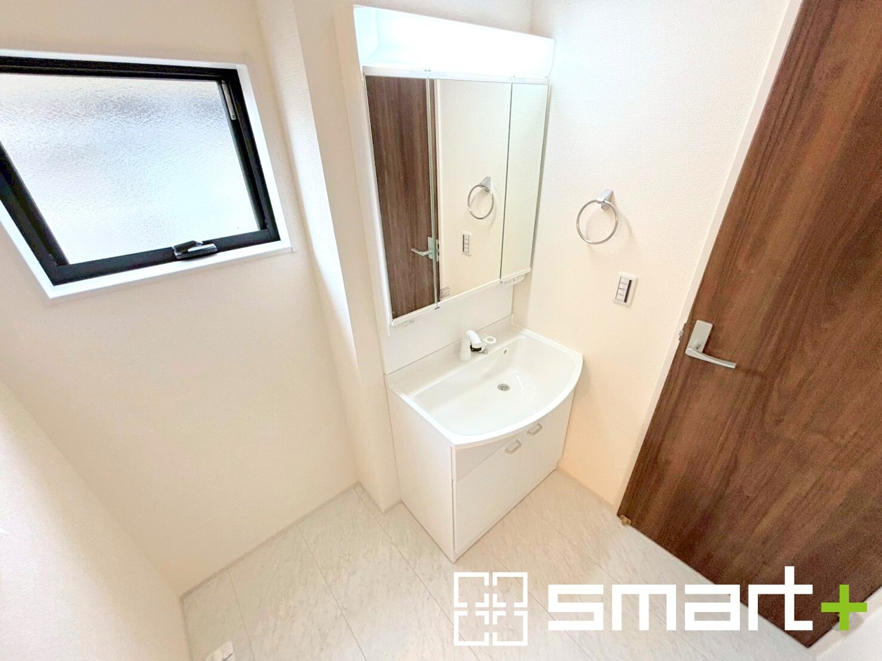 ~明るい洗面スペース~ ・窓から明るい陽が入り、気持ちよく朝の支度ができますね。 ・使い勝手の良い三面鏡タイプのシャワー付き洗面化粧台。鏡の裏に収納があるので洗面台周りもスッキリ。