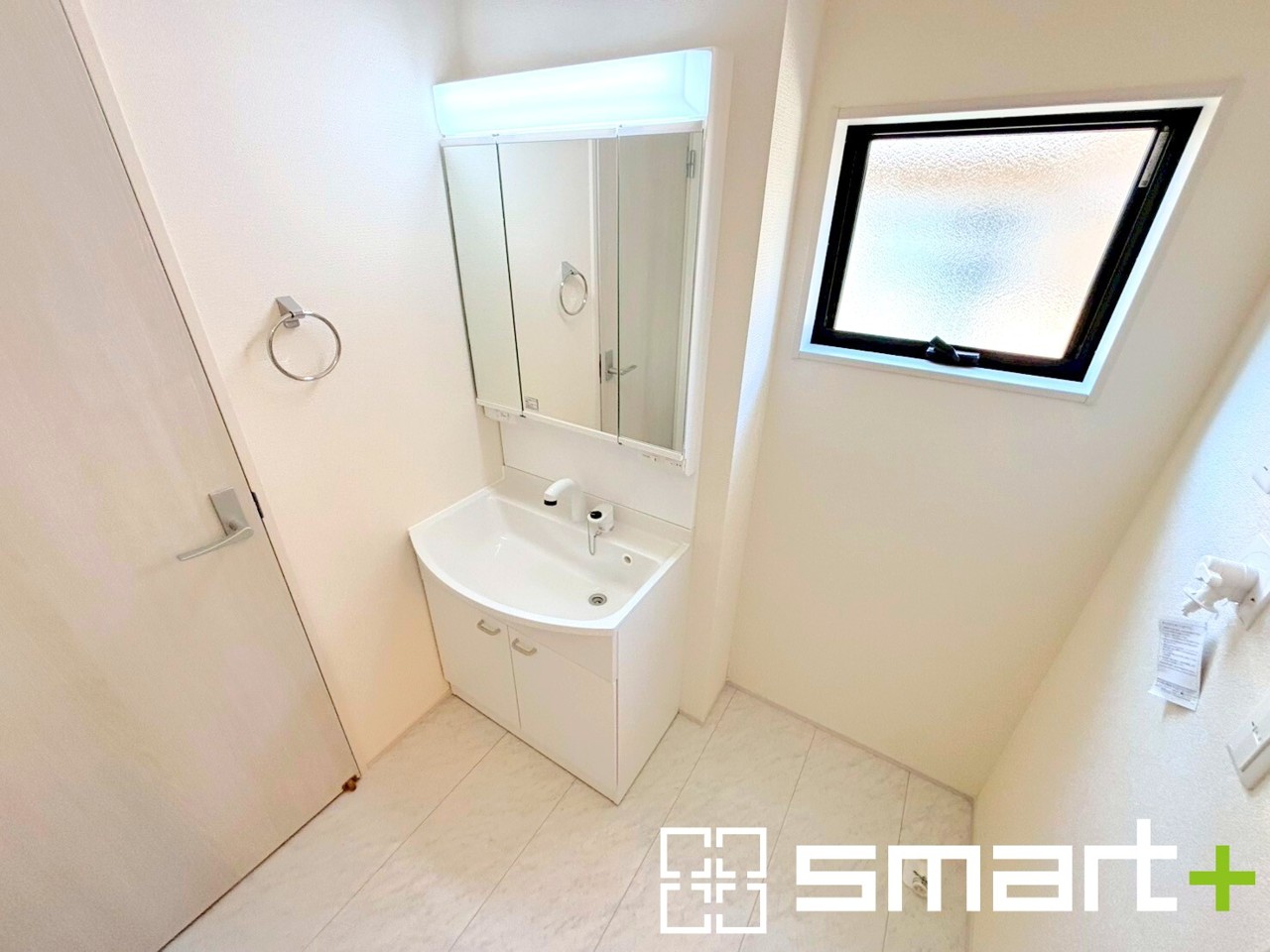 ~明るい洗面スペース~ ・窓から明るい陽が入り、気持ちよく朝の支度ができますね。 ・使い勝手の良い三面鏡タイプのシャワー付き洗面化粧台。鏡の裏に収納があるので洗面台周りもスッキリ。