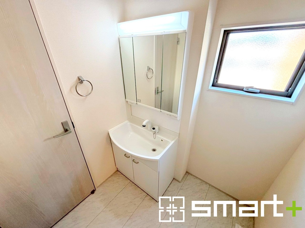 ~明るい洗面スペース~ ・窓から明るい陽が入り、気持ちよく朝の支度ができますね。 ・使い勝手の良い三面鏡タイプのシャワー付き洗面化粧台。鏡の裏に収納があるので洗面台周りもスッキリ。