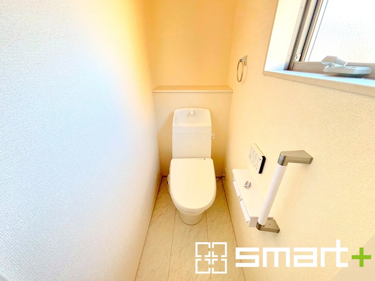 ~窓付きの明るいトイレ~ ・清潔感あるシャワートイレ。窓があるので換気もしやすく快適ですね。 ・背面にある棚はトイレットペーパーなどの置き場や飾り棚としても利用できますね。