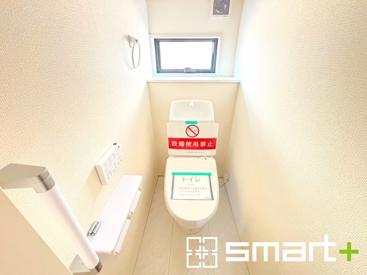 ~窓付きの明るいトイレ~ ・清潔感あるシャワートイレ。窓があるので換気もしやすく快適ですね。 ・背面にある棚はトイレットペーパーなどの置き場や飾り棚としても利用できますね。