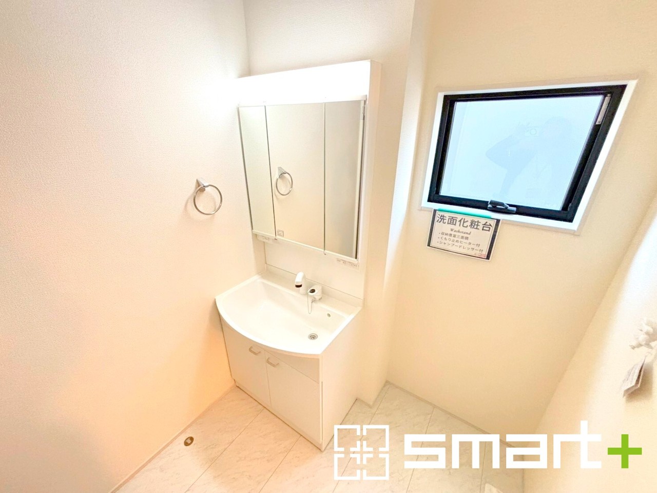 ~明るい洗面スペース~ ・窓から明るい陽が入り、気持ちよく朝の支度ができますね。 ・使い勝手の良い三面鏡タイプのシャワー付き洗面化粧台。鏡の裏に収納があるので洗面台周りもスッキリ。