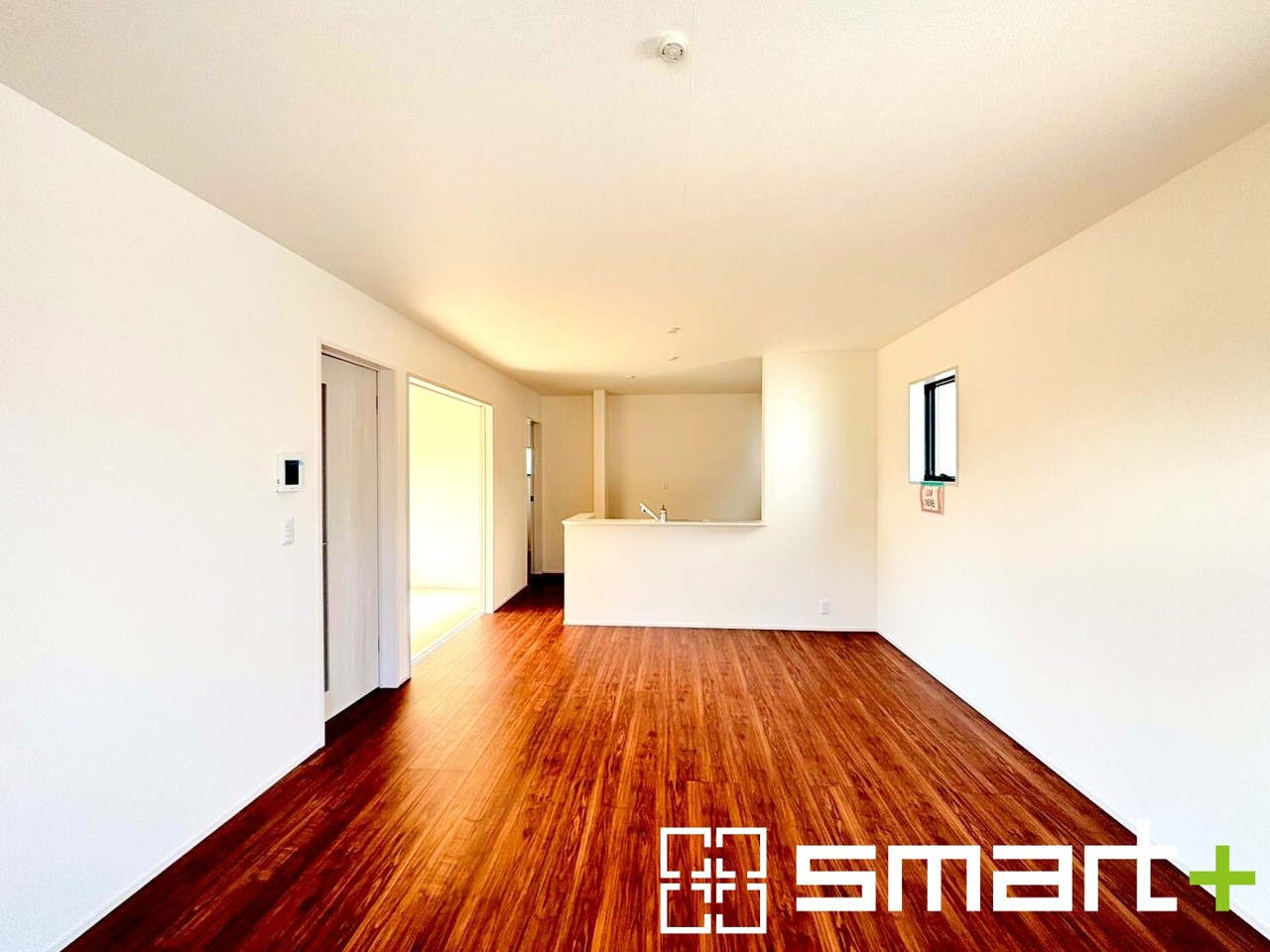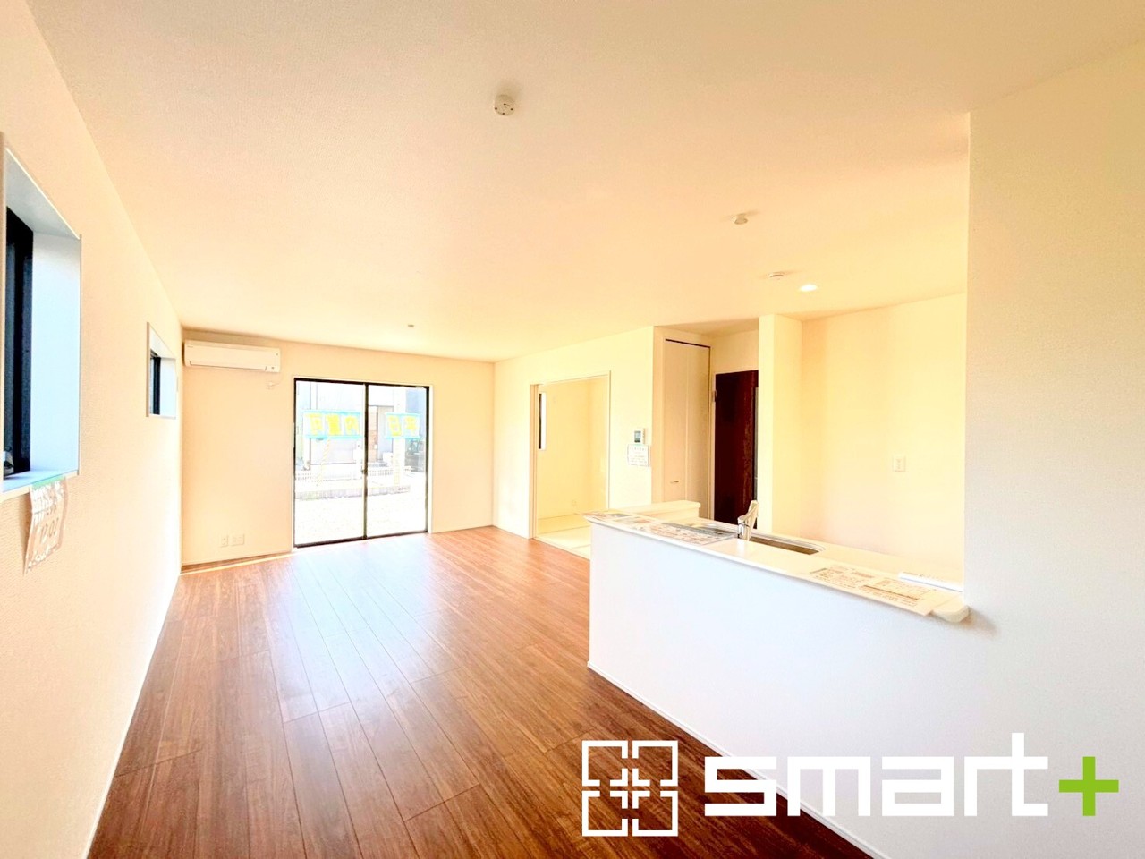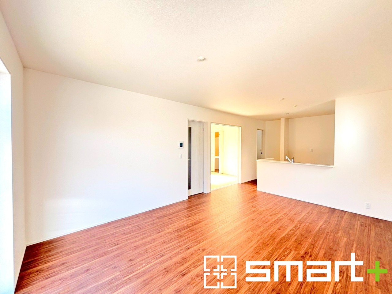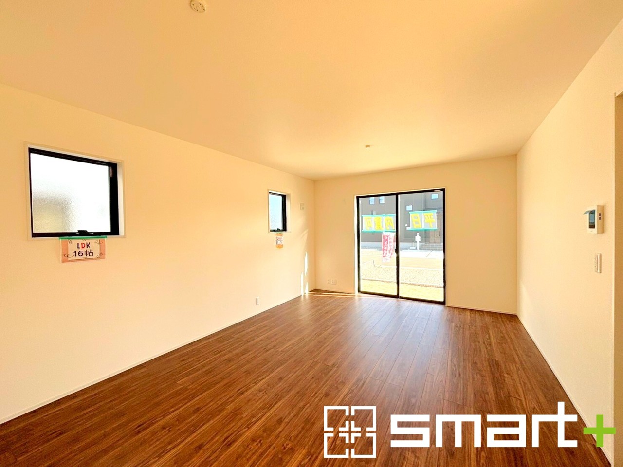 1号棟 ~穏やかな陽の入るLDK~ ・大きな窓のあるLDKは陽当りも良好で明るい空間となっております。 ・ご家族団らんなど過ごす時間の多いLDKが明るいのは嬉しいポイントですね。