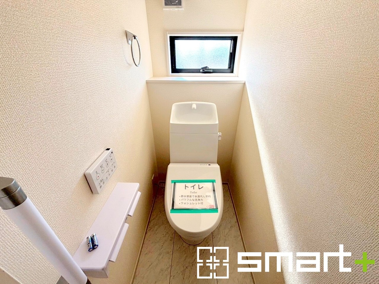 ~窓付きの明るいトイレ~ ・清潔感あるシャワートイレ。窓があるので換気もしやすく快適ですね。 ・背面にある棚はトイレットペーパーなどの置き場や飾り棚としても利用できますね。 (1号棟)