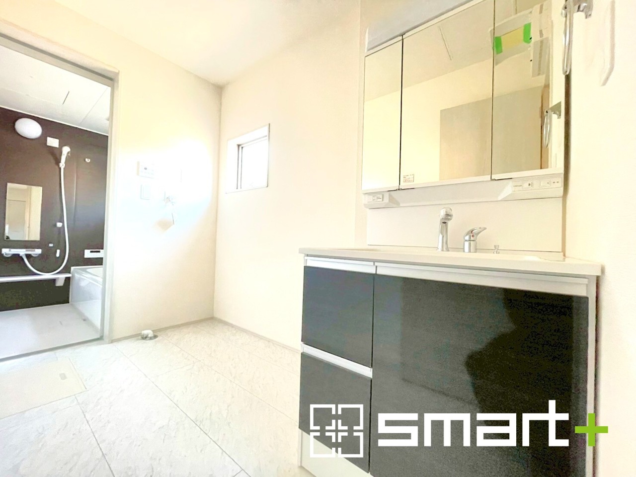 ~人気の三面鏡を採用~ ・洗面台は三面鏡仕様なので鏡の角度を変える事で頭の後ろの方までご確認可能です。 ・鏡の裏が収納になっておりますので、洗面台周りもスッキリと片付きます。 (1号棟)