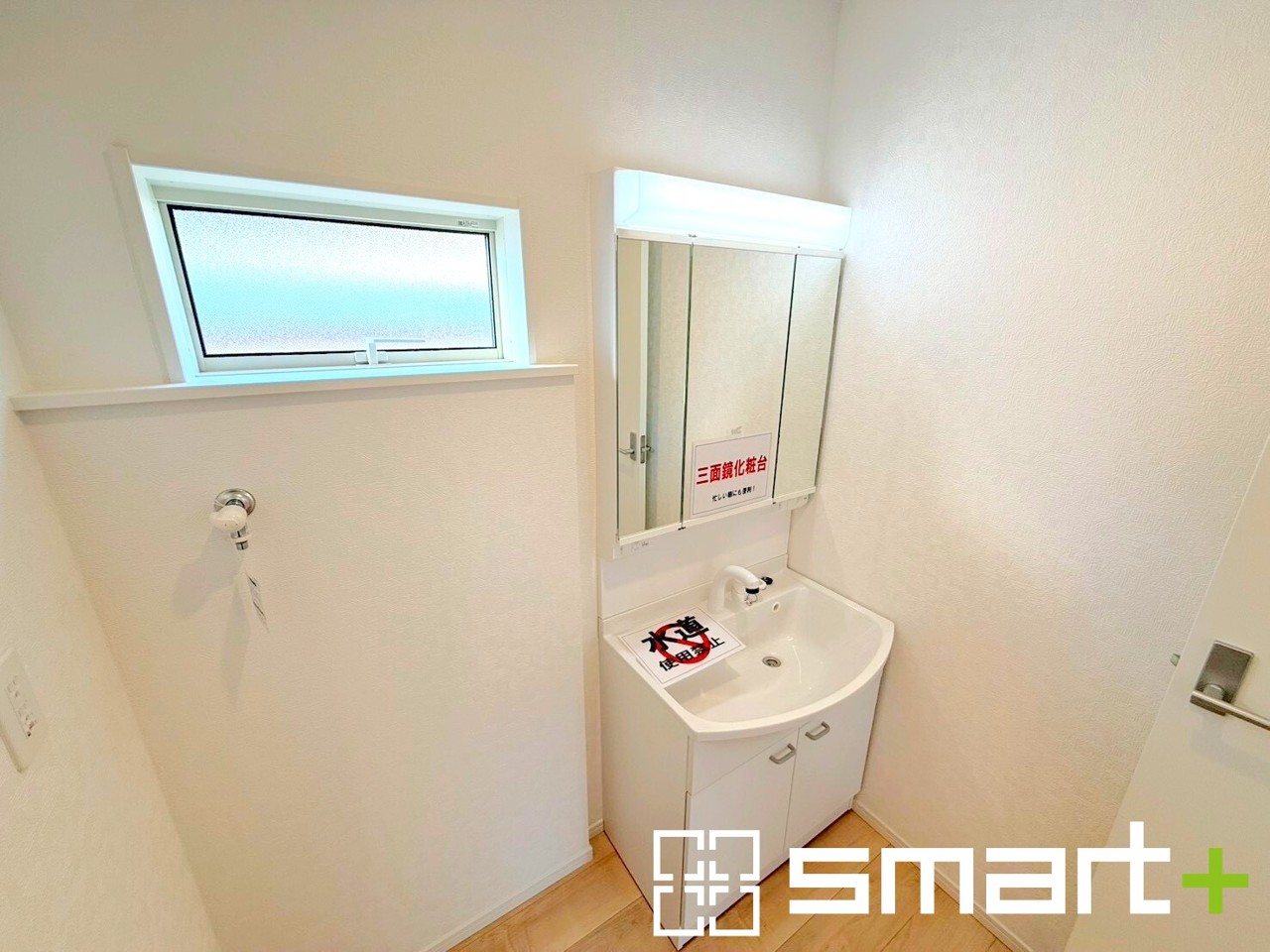 ~明るい洗面スペース~ ・窓から明るい陽が入り、気持ちよく朝の支度ができますね。 ・使い勝手の良い三面鏡タイプのシャワー付き洗面化粧台。鏡の裏に収納があるので洗面台周りもスッキリ。