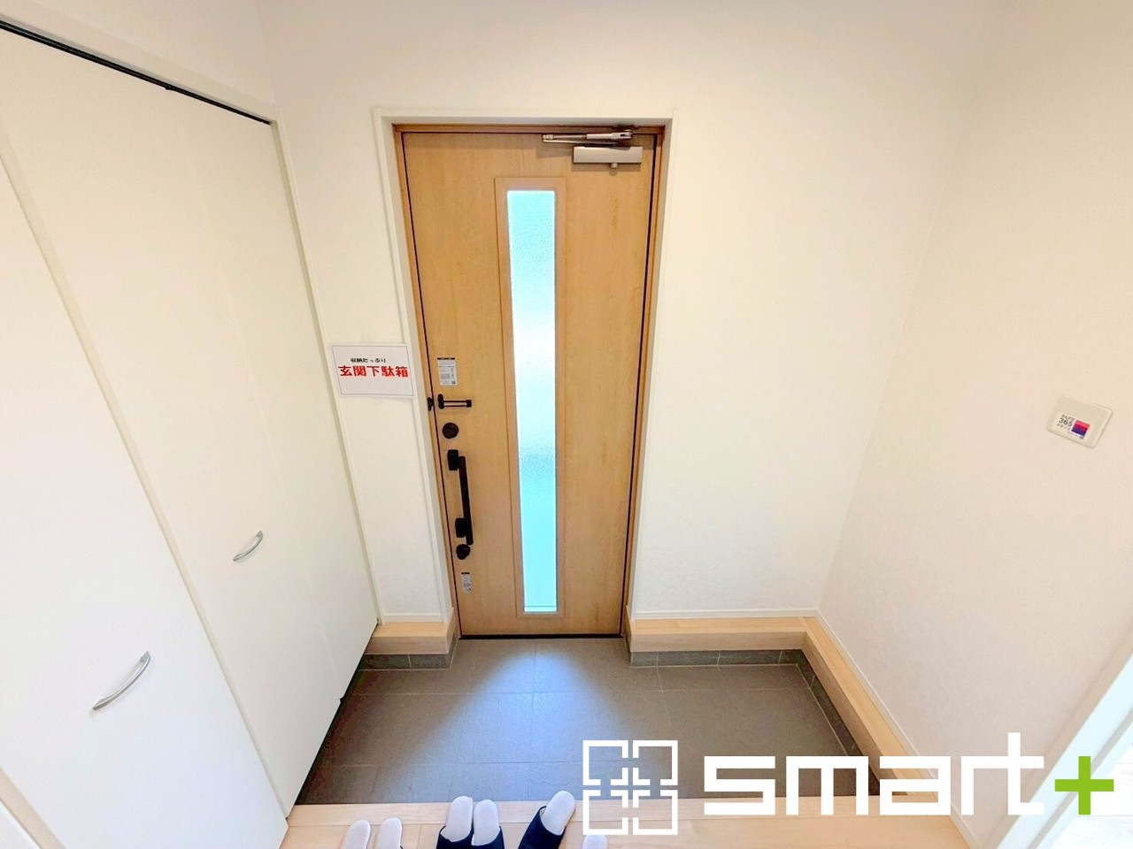 ~穏やかな陽が入る玄関~ ・玄関ドアにガラス部分を設ける事で穏やかな陽の入る玄関になります。 ・備え付けのシューズボックスはたっぷりしまえて玄関がスッキリ片付きますね。