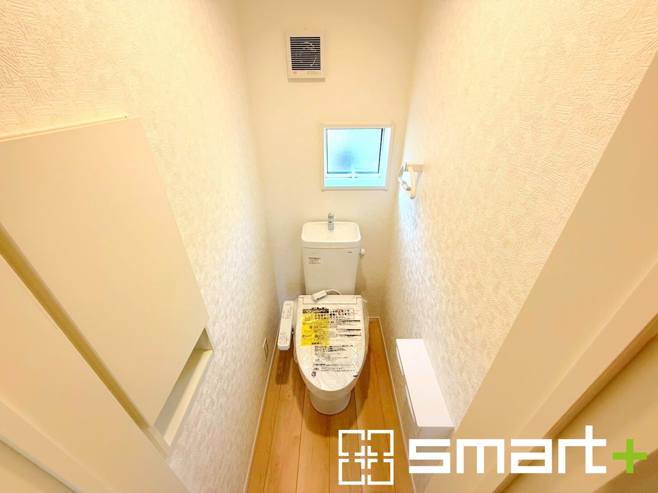 ~窓付きの明るいトイレ~ ・使用後や掃除の際に窓を開ければ、外からの新鮮な空気を取り込み素早く換気ができます。 ・埋め込み収納付きでストックや掃除用具もスッキリ片付きますね。