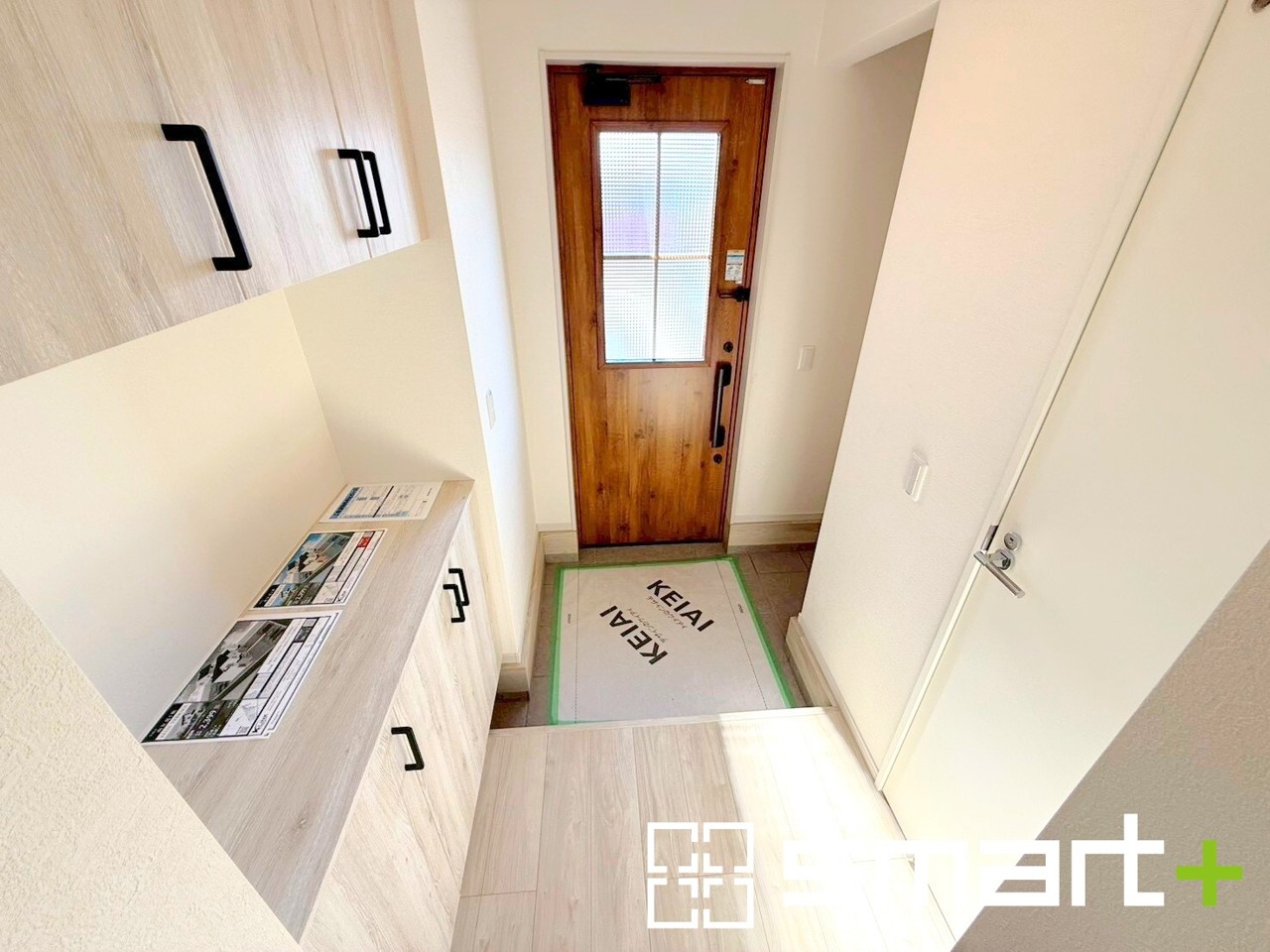~穏やかな陽が入る玄関~ ・玄関ドアにガラス部分を設ける事で穏やかな陽の入る玄関になります。 ・備え付けのシューズボックスはたっぷりしまえて玄関がスッキリ片付きますね。
