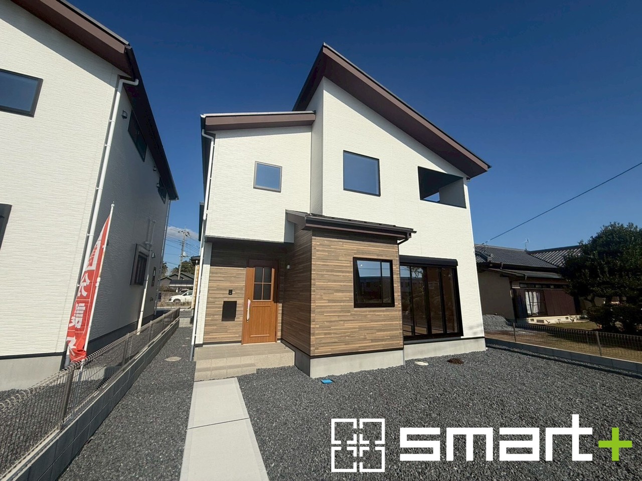 ~モダンな印象の外観~ ・ホワイトカラーに木目調をアクセントとしたことで温かみのある落ち着いた印象の外観。 ・見た目に重厚感が生まれ、高級感のある仕様となっております。