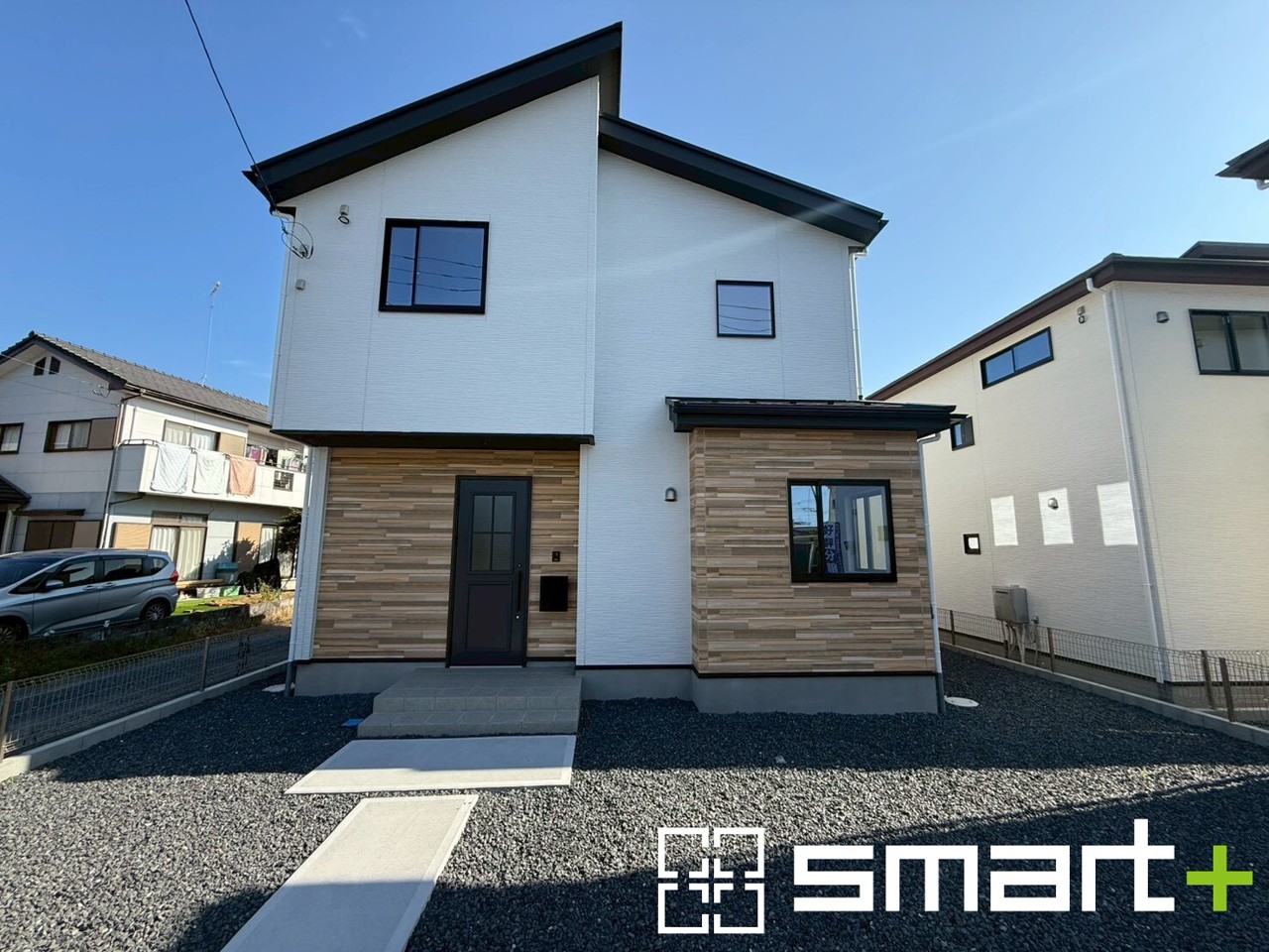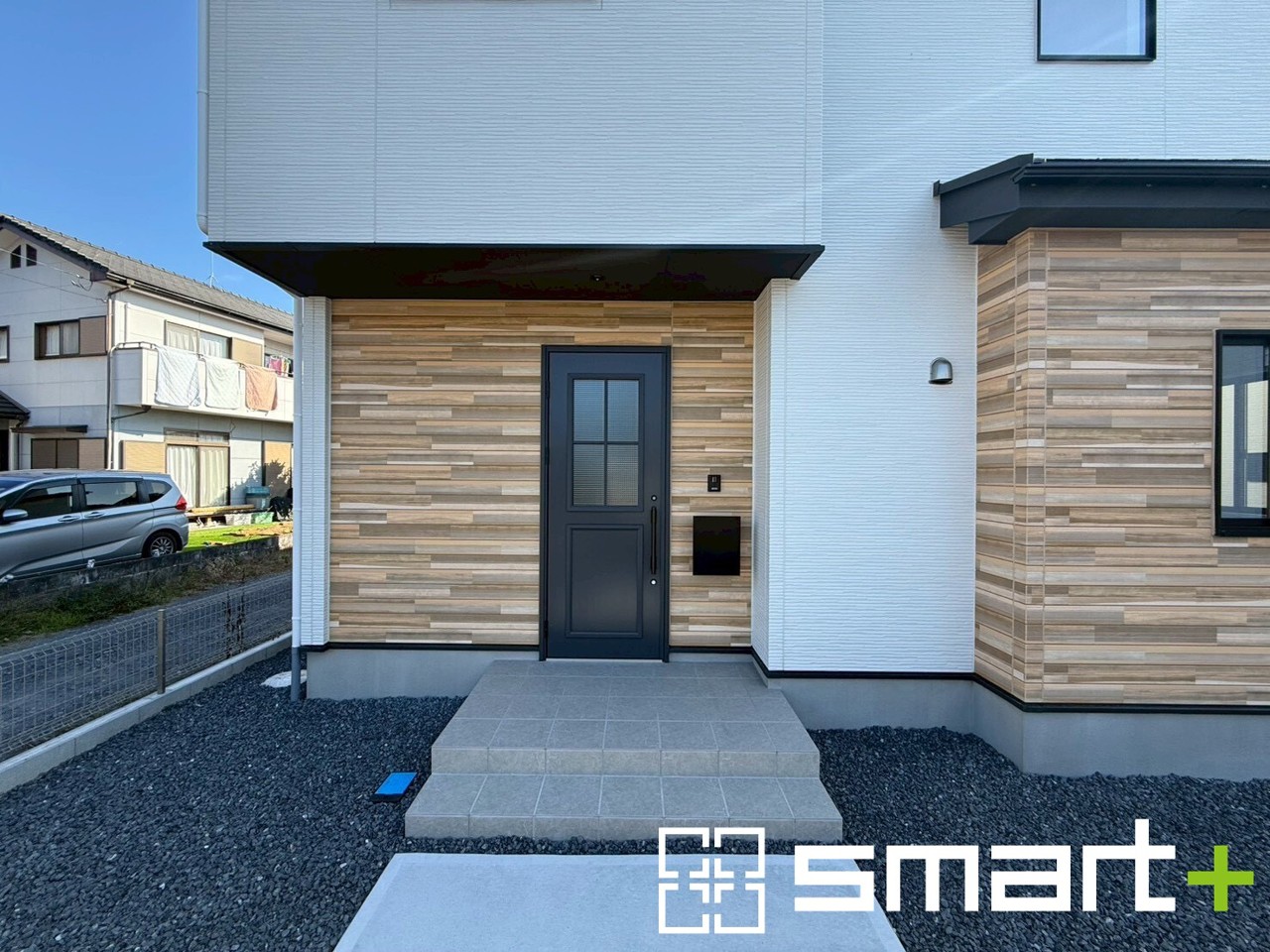 ~モダンな印象の外観~ ・ホワイトカラーに木目調をアクセントとしたことで温かみのある落ち着いた印象の外観。 ・見た目に重厚感が生まれ、高級感のある仕様となっております。 (1号棟)