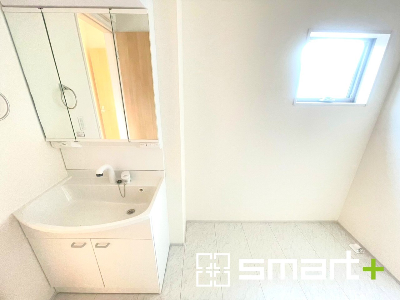 ~明るい洗面スペース~ ・窓から明るい陽が入り、気持ちよく朝の支度ができますね。 ・使い勝手の良い三面鏡タイプのシャワー付き洗面化粧台。鏡の裏に収納があるので洗面台周りもスッキリ。