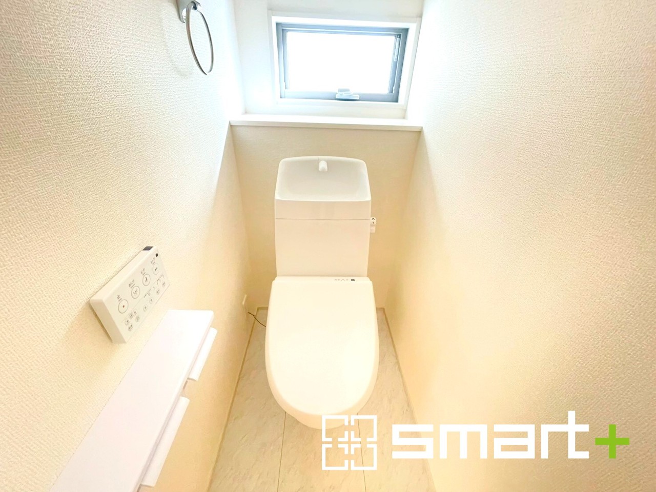 ~窓付きの明るいトイレ~ ・清潔感あるシャワートイレ。窓があるので換気もしやすく快適ですね。 ・背面にある棚はトイレットペーパーなどの置き場や飾り棚としても利用できますね。