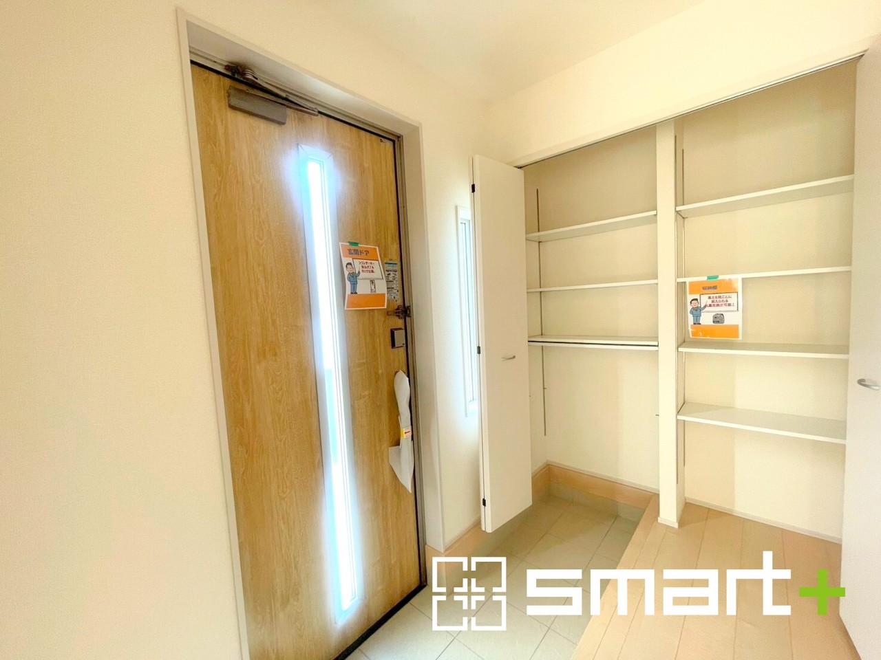 ~穏やかな陽が入る玄関~ ・窓に加えて玄関ドアのガラス部分からも穏やかな陽が入り、明るい玄関になります。 ・備え付けのシューズボックスはたっぷりしまえて玄関がスッキリ片付きますね。