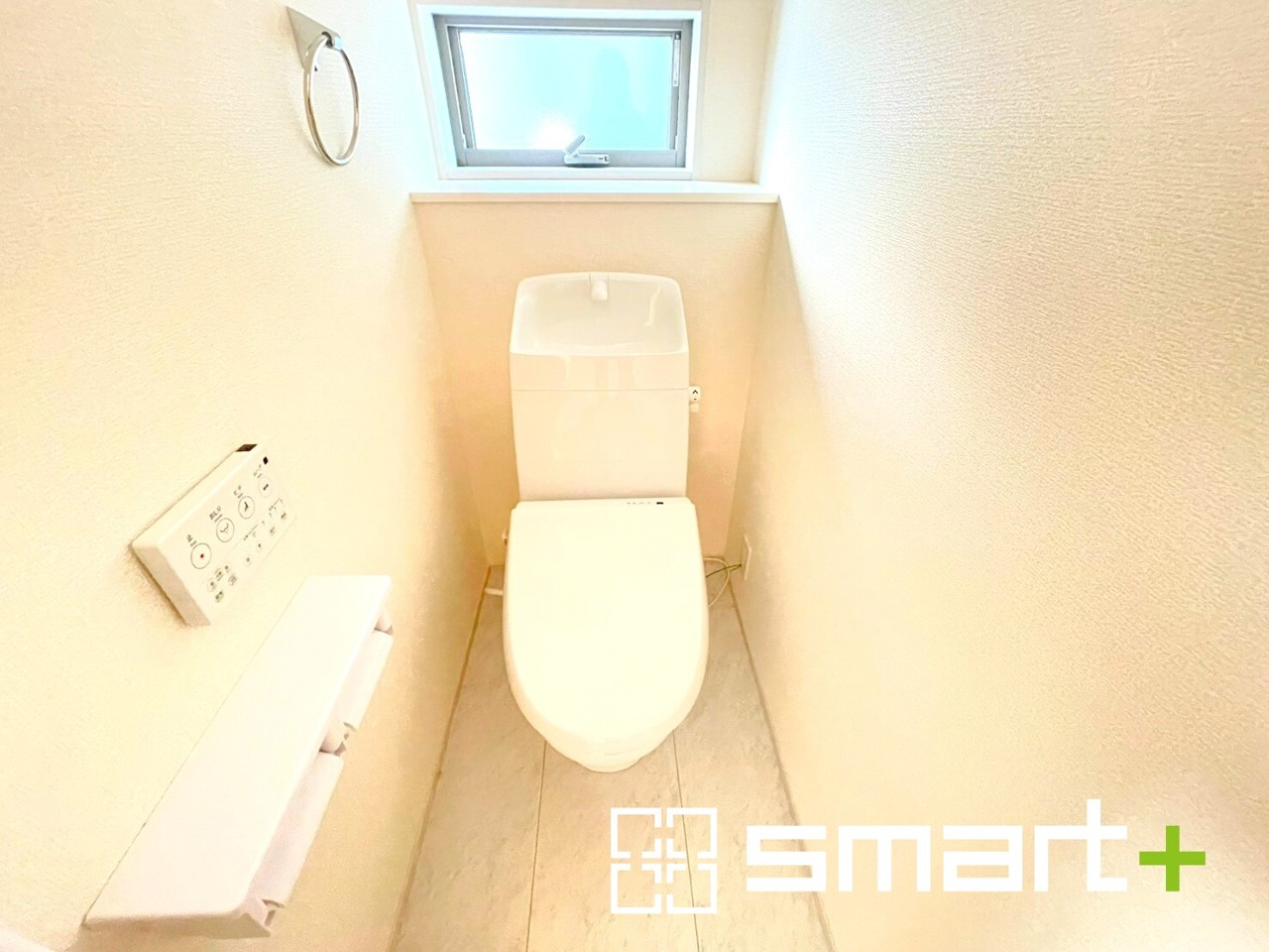 ~窓付きの明るいトイレ~ ・清潔感あるシャワートイレ。窓があるので換気もしやすく快適ですね。 ・背面にある棚はトイレットペーパーなどの置き場や飾り棚としても利用できますね。