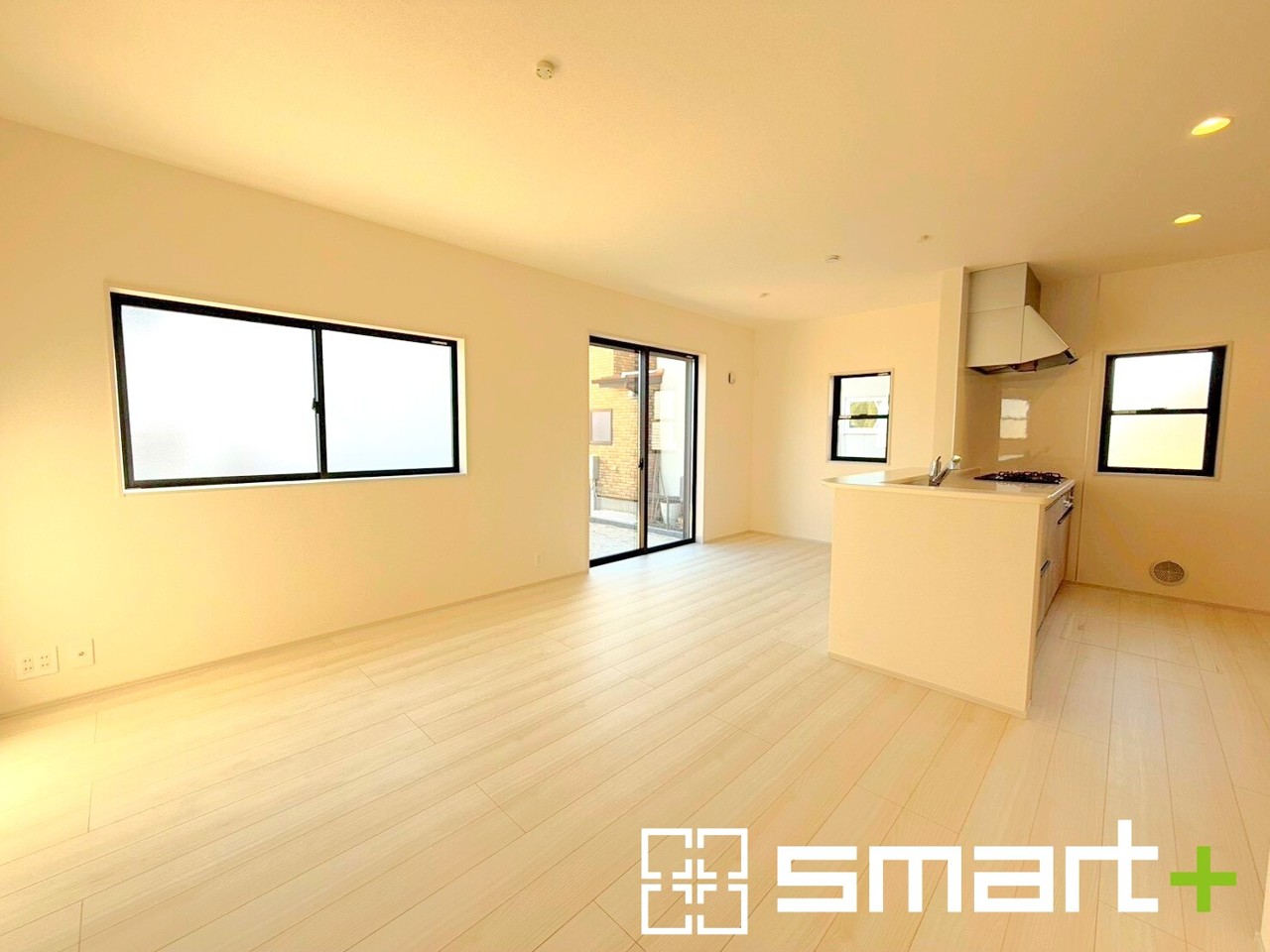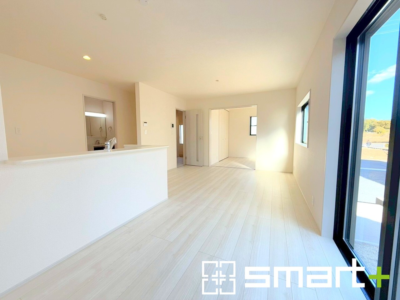 1号棟 ~穏やかな陽の入るLDK~ ・大きな窓のあるLDKは陽当りも良好で明るい空間となっております。 ・ご家族団らんなど過ごす時間の多いLDKが明るいのは嬉しいポイントですね。