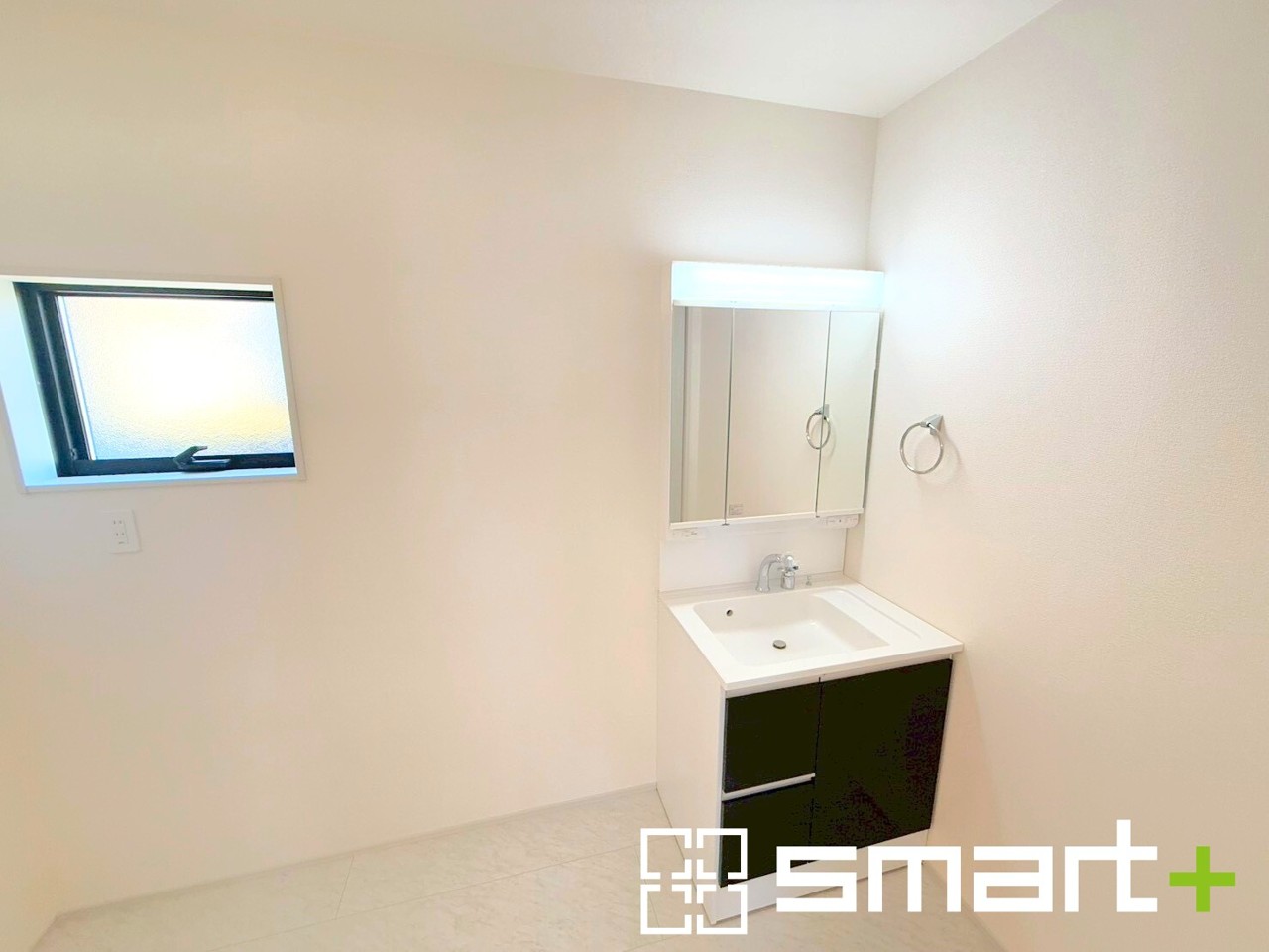 1号棟 ~明るい洗面スペース~ ・窓から明るい陽が入り、気持ちよく朝の支度ができますね。 ・使い勝手の良い三面鏡タイプのシャワー付き洗面化粧台。鏡の裏に収納があるので洗面台周りもスッキリ。