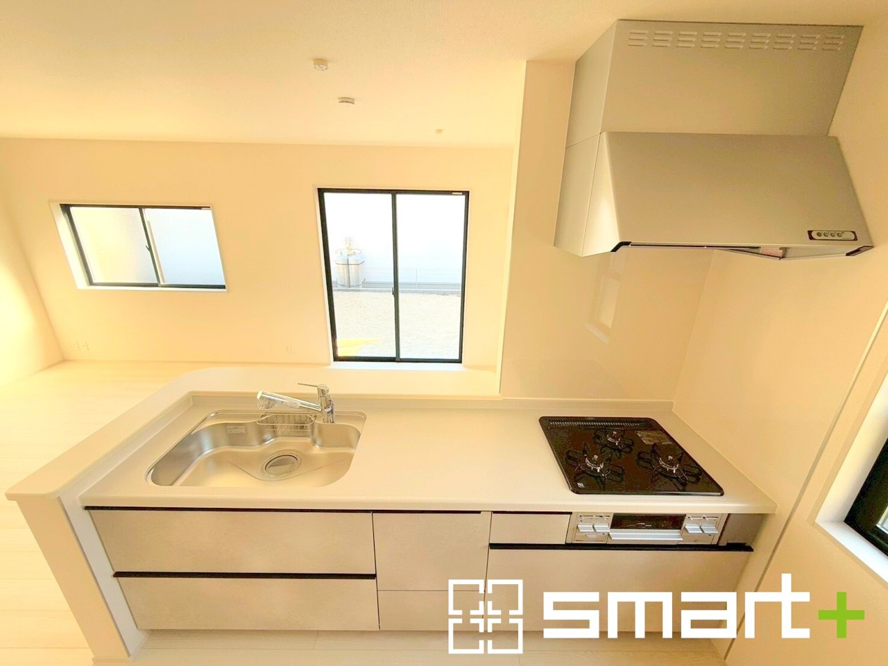 2号棟 ~人気のカウンターキッチン~ ・キッチンには余計な柱が無いので、リビングが見渡せ開放感のある造りとなっております。 ・蛇口には浄水器が内蔵されるなど機能面でも優れたキッチンです。