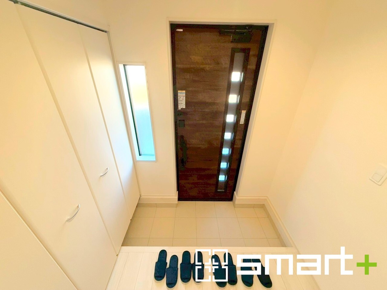 ~穏やかな陽が入る玄関~ ・窓に加えて玄関ドアのガラス部分からも穏やかな陽が入り、明るい玄関になります。 ・備え付けのシューズボックスはたっぷりしまえて玄関がスッキリ片付きますね。 (1号棟)