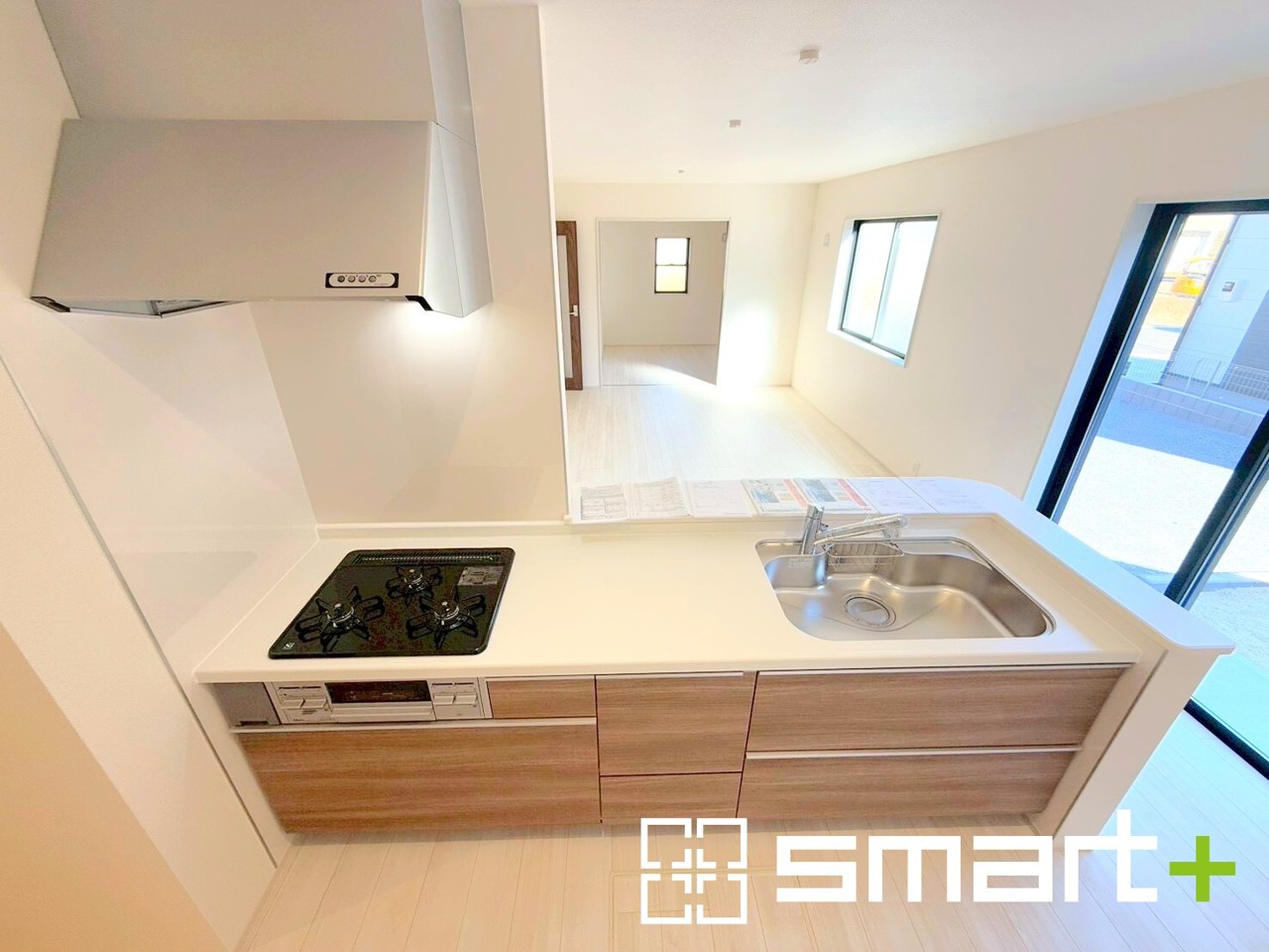 1号棟 ~人気のカウンターキッチン~ ・キッチンには余計な柱が無いので、リビングが見渡せ開放感のある造りとなっております。 ・蛇口には浄水器が内蔵されるなど機能面でも優れたキッチンです。