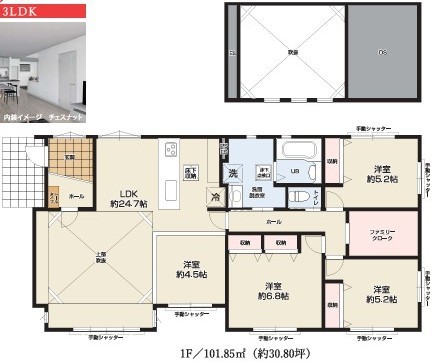 | 間取 | 3LDK + ファミリークローク、間仕切対応で5LDKに変更可 (LDK29.2帖、洋室6.8帖、洋室5.2帖、洋室5.2帖) | ||