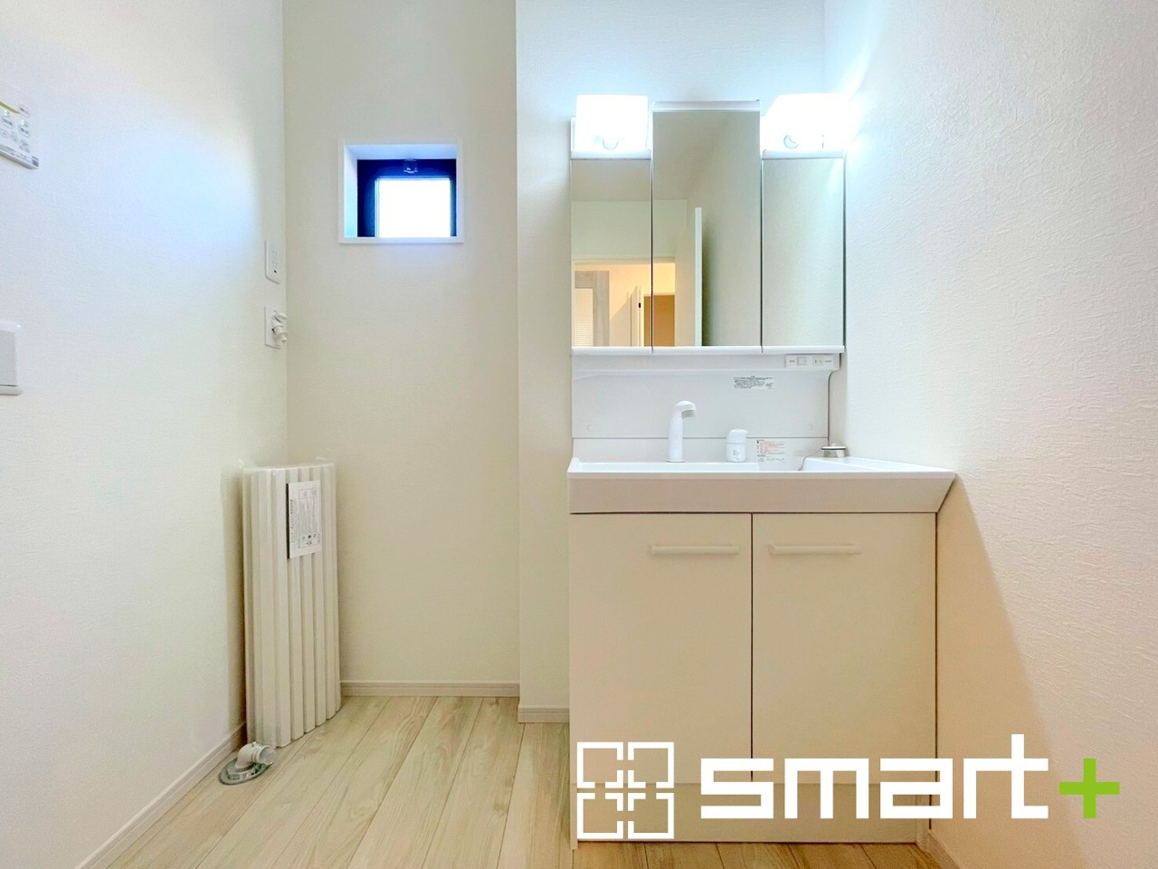 2号棟 ~人気の三面鏡を採用~ ・洗面台は三面鏡仕様なので鏡の角度を変える事で頭の後ろの方までご確認可能です。 ・鏡の裏が収納になっておりますので、洗面台周りもスッキリと片付きます。