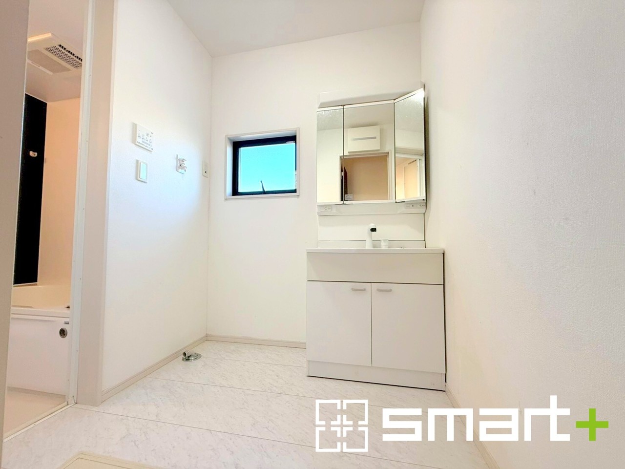~人気の三面鏡を採用~ ・洗面台は三面鏡仕様なので鏡の角度を変える事で頭の後ろの方までご確認可能です。 ・鏡の裏が収納になっておりますので、洗面台周りもスッキリと片付きます。