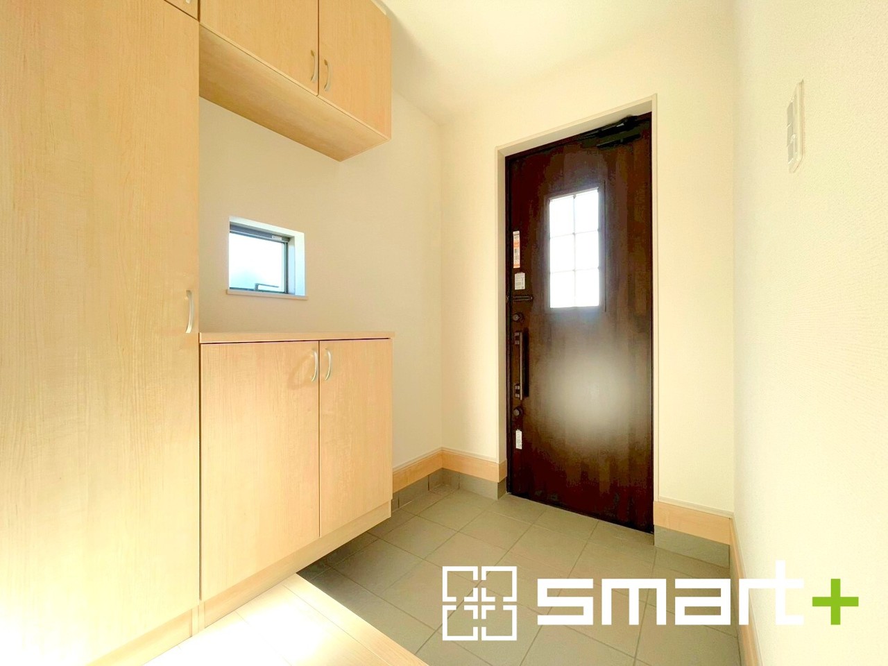 ~穏やかな陽が入る玄関~ ・窓に加えて玄関ドアのガラス部分からも穏やかな陽が入り、明るい玄関になります。 ・飾り棚としても演出できるコの字型のシューズボックスは大容量の収納力。