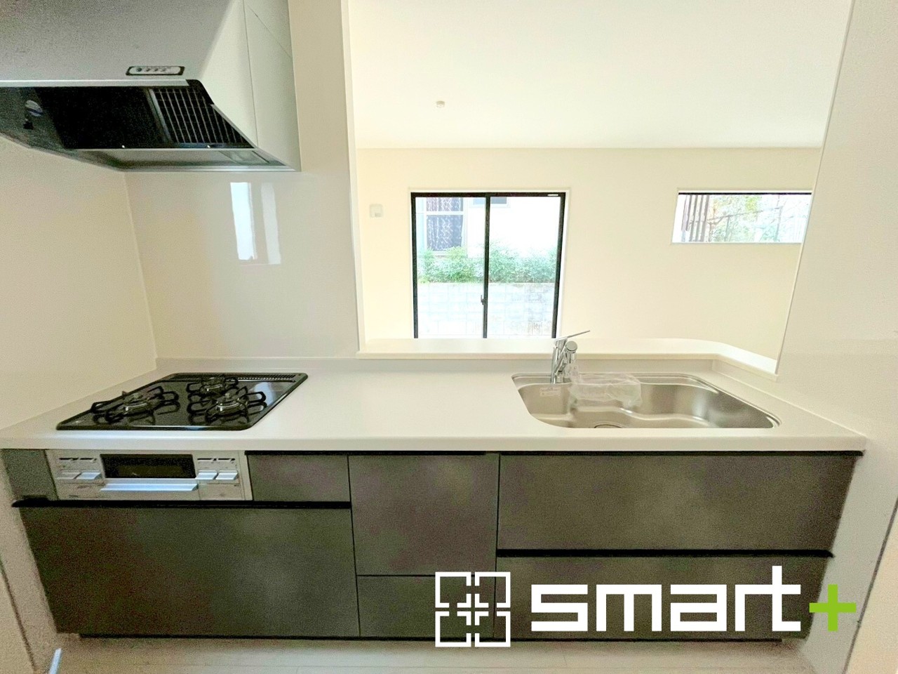 2号棟 ~使い勝手の良いシステムキッチン~ ・料理がしやすい設計のキッチンでお料理もはかどりますね。 ・もちろんキッチン下部は収納になっておりますので、フライパンなども収納可能です。
