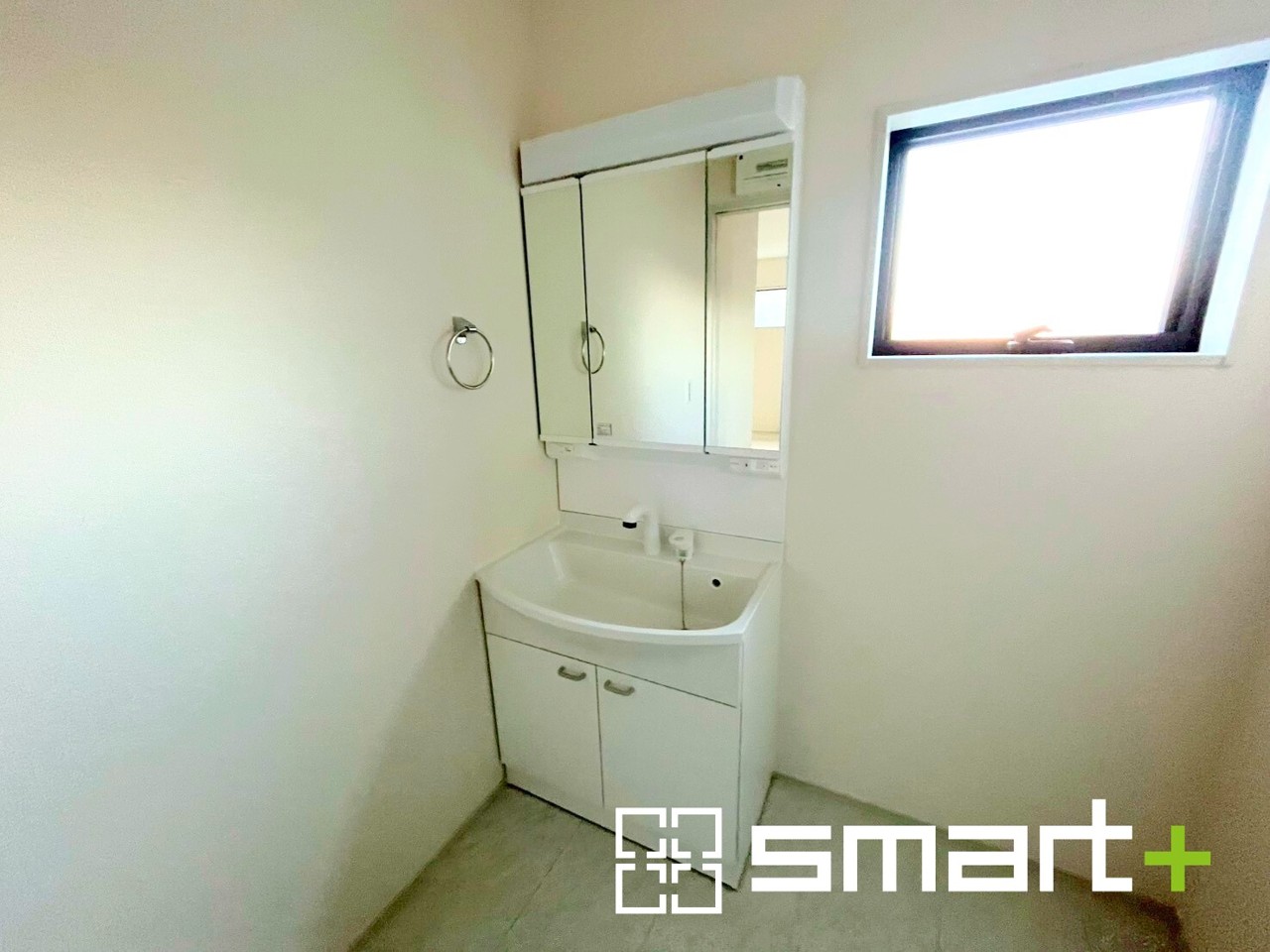 1号棟 ~人気の三面鏡を採用~ ・洗面台は三面鏡仕様なので鏡の角度を変える事で頭の後ろの方までご確認可能です。 ・鏡の裏が収納になっておりますので、洗面台周りもスッキリと片付きます。